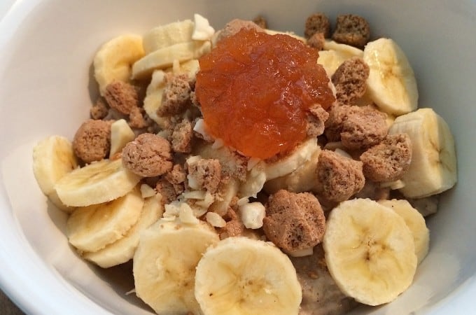 Verdeel de havermout over 2 bakjes. Snijd de banaan in plakjes en verdeel deze over de havermout. Bestrooi met de gehakte kruidnoten en amandelen en garneer met een toefje abrikozenjam. In mijn geval had ik pompoenjam en dat was amazing door de havermout. Maar dat is lastig verkrijgbaar in Nederland en daarom is abrikozenjam een goed alternatief. Of je laat de jam helemaal achterwege.