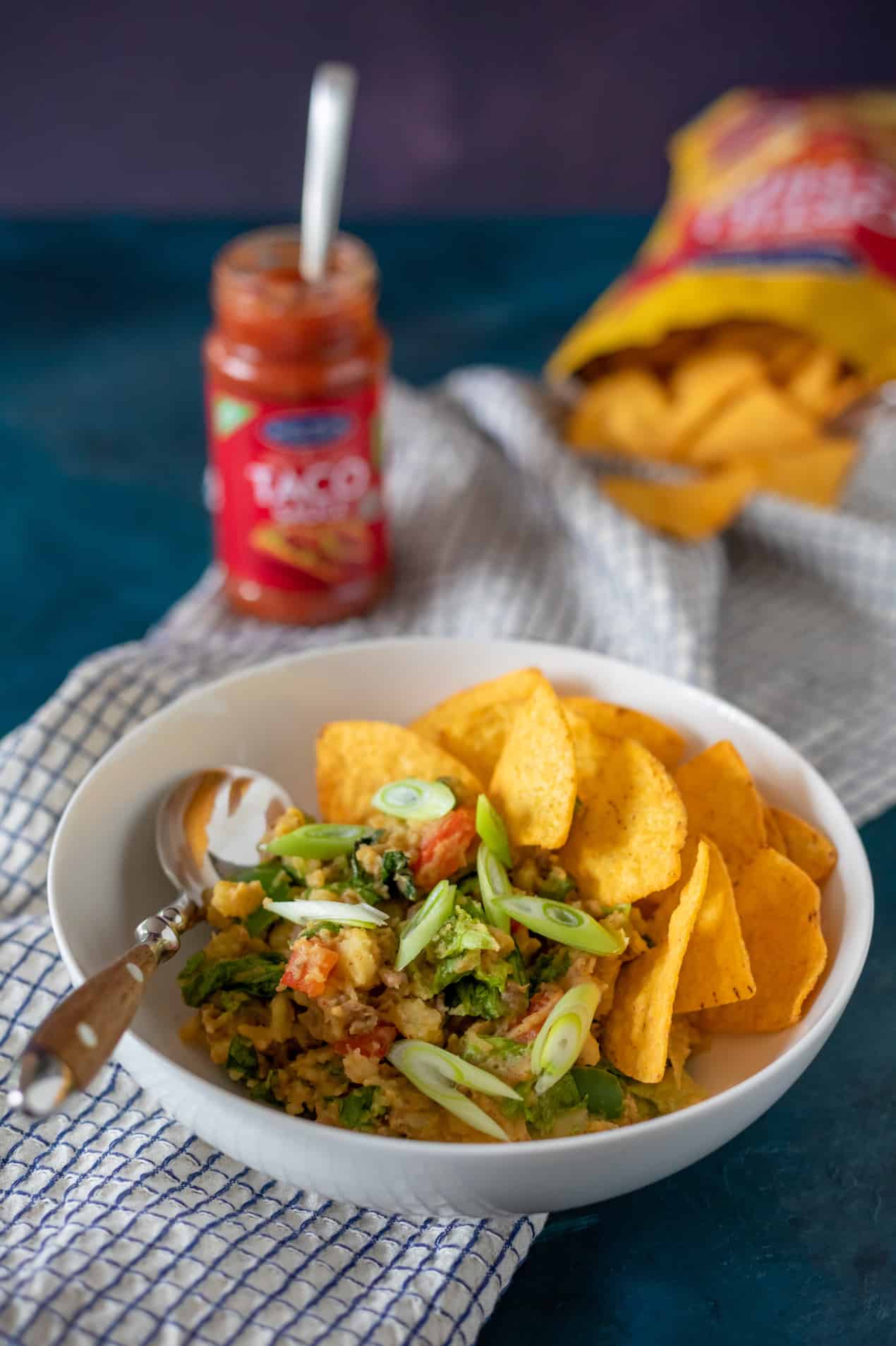 - Serveer de Tex Mex taco stamppot met de tortilla chips ‘on top’ en zet het potje tacosaus ook op tafel.