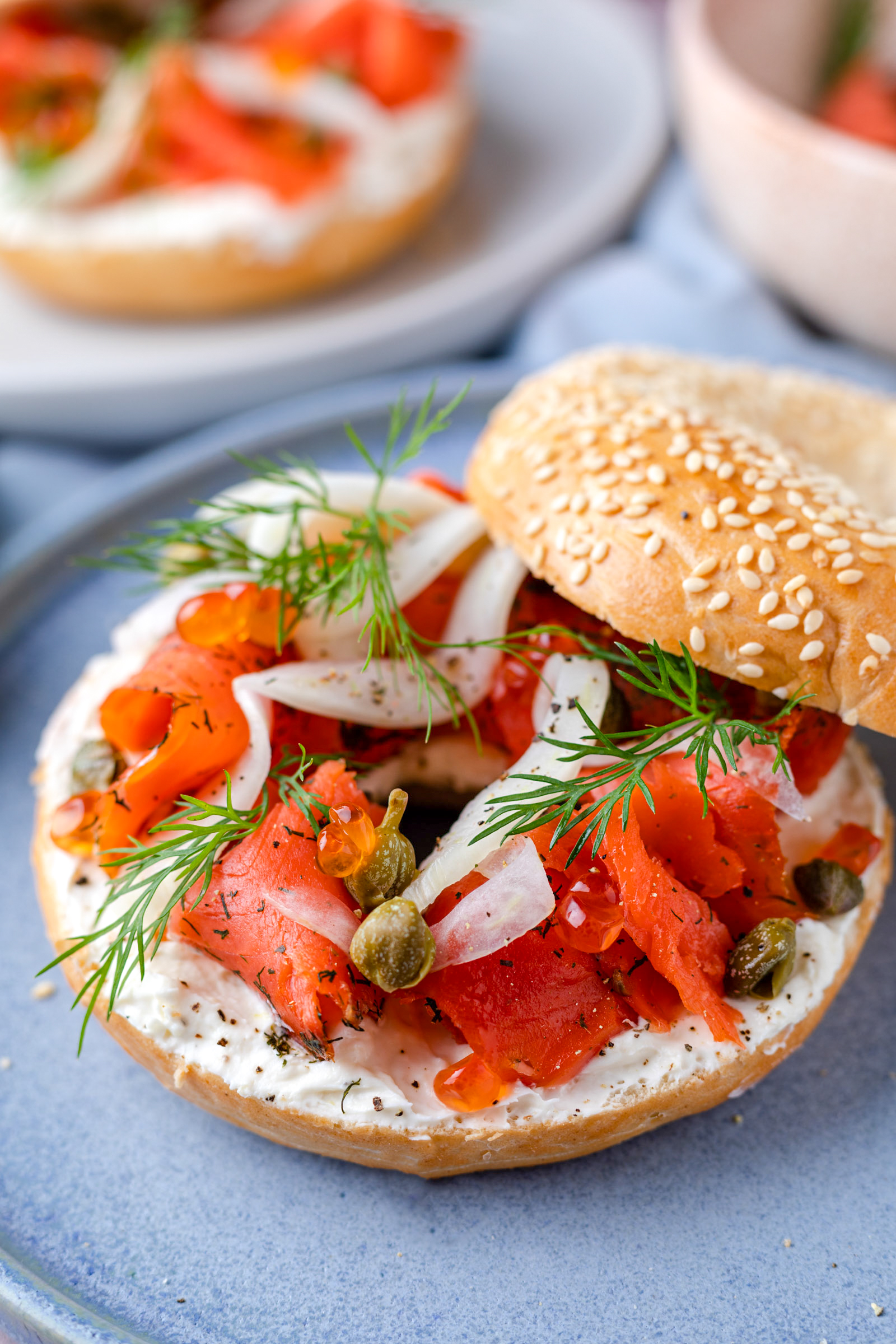- Snijd de afgebakken bagels open en besmeer de onderkant royaal met de roomkaas. Beleg deze met de gravad lachs en wat van de zoetzure plakjes venkel (dep deze eerst even droog met keukenpapier), kappertjes en wat sprietjes dille. Garneer optioneel met de wilde zalm kaviaar en serveer direct.