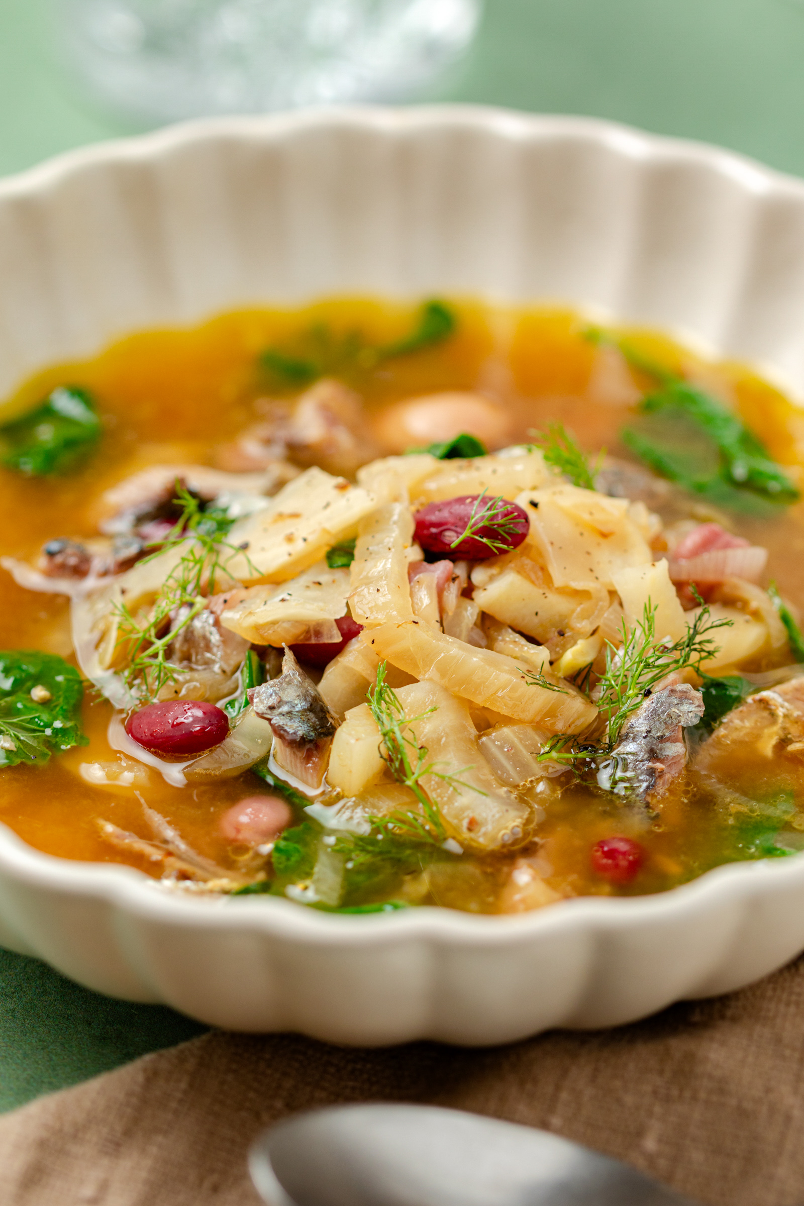 Er zijn van die recepten die je gewoon wilt maken als het buiten guur en donker is. Deze geurige bouillon met venkel, bonen en sardines is er zo eentje. Het is een heerlijk hartverwarmend gerecht dat barst van de smaak, dankzij de frisse venkel, romige bonen en de volle sardines. Of je het nu serveert als voorgerecht, lunch of bij een uitgebreide brunch met knapperig zuurdesembrood, deze soep past altijd. Wat ik er extra fijn aan vind? Het is voedzaam, snel te maken en je kunt er zelfs groente restjes in kwijt. Echt zo’n recept dat je steeds weer wilt maken. Laat de kou maar komen!
