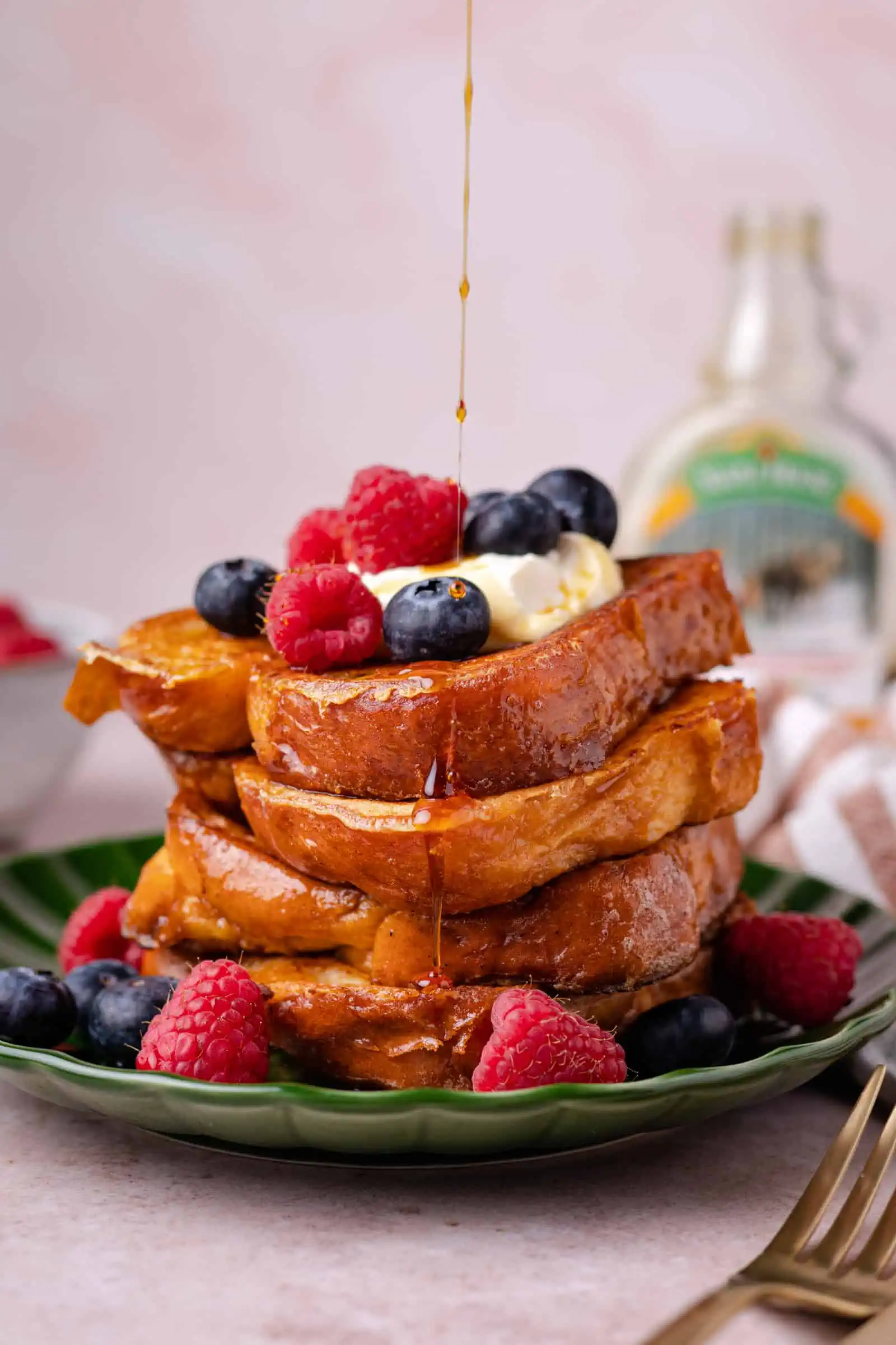In mijn recept top ik de brioche wentelteefjes af met lemon curd room, rood fruit en ahornisroop. Maar je kunt iedere topping kiezen die je lekker vindt. Met alleen slagroom of een combinatie van Griekse yoghurt en room. En in principe zijn alle soorten fruit bruikbaar, wij vinden de combinatie van banaan, gesmolten chocolade en ahornsiroop ook heel lekker.
