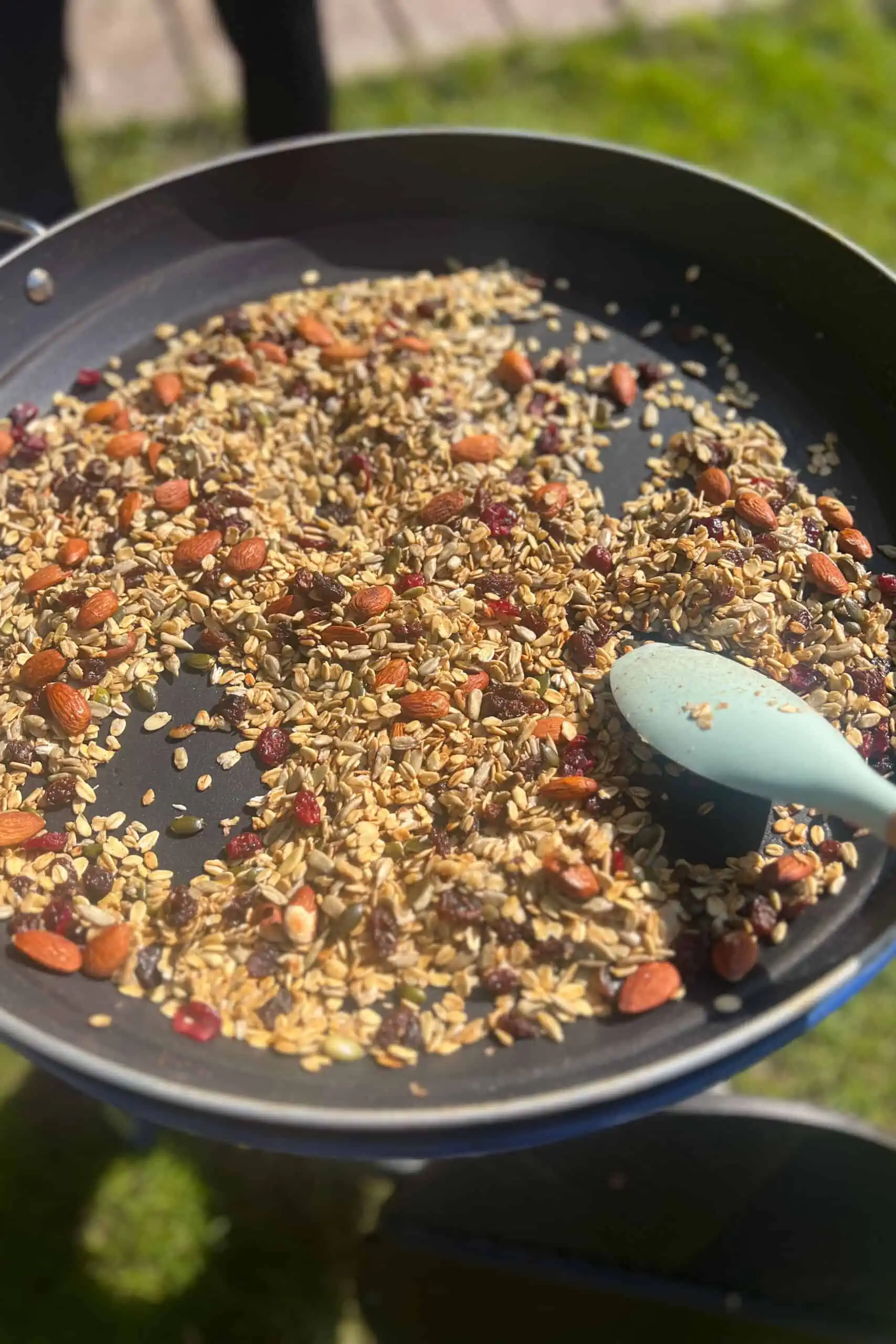 Wellicht denk je dat je granola alleen in de oven kunt maken, maar niets is minder waar. Granola uit de pan werkt namelijk ook heel goed. En als jij voor de camping ook zo’n fijne skottelbraai hebt dan heb je binnen 10 minuten ook je camping granola klaar voor het ontbijt. Ik ben echt groot fan van de Cadac barbecues voor op de camping. Deze granola maakte ik op een skottelbraai van vrienden van ons die al jaren meegaat. Mij maak je echt helemaal blij met de enorme paellpan die erbij zit. Daarin kun je namelijk ontzettend veel bereiden, waaronder deze granola.