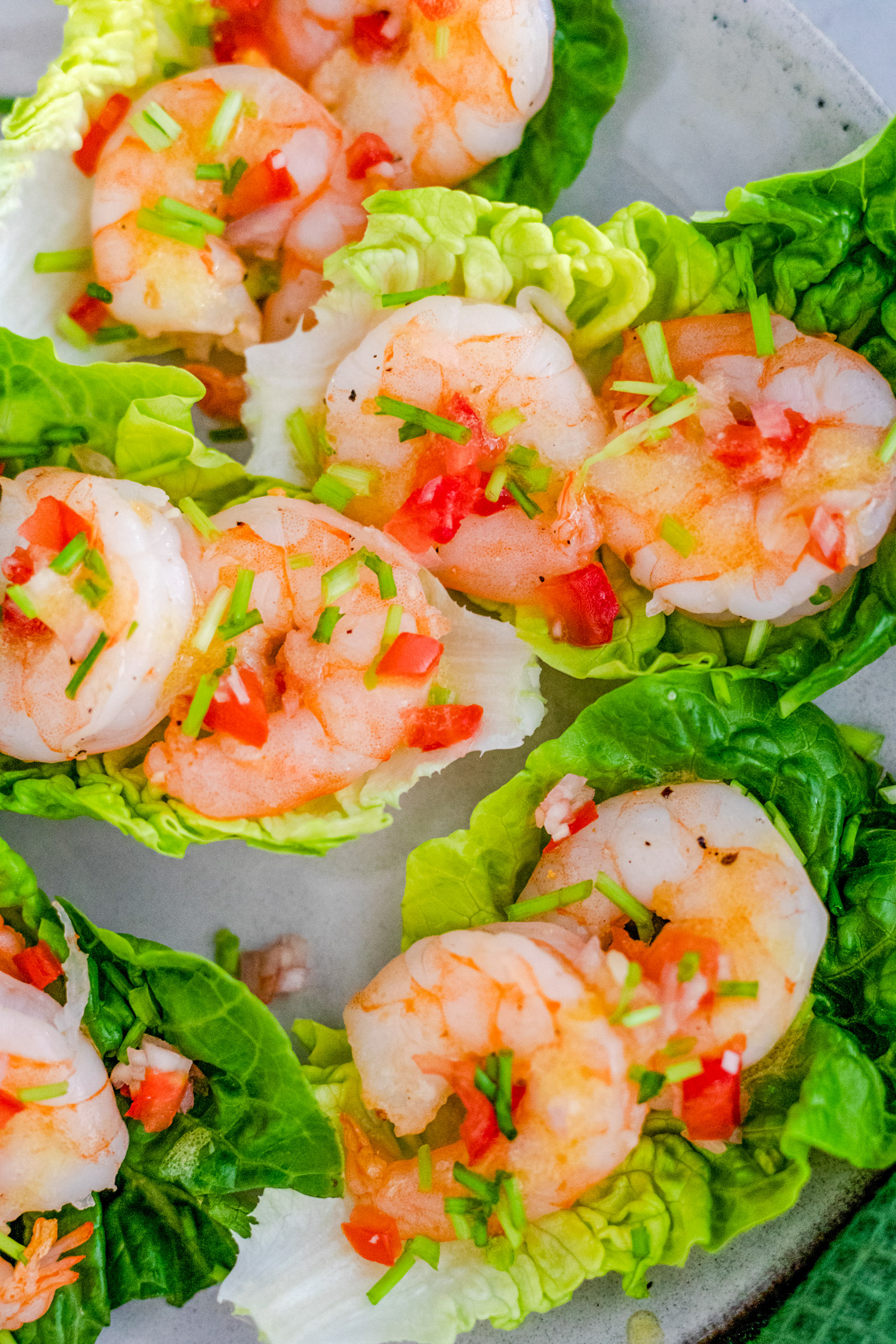 - Verdeel de garnalen vanuit de pan direct op de blaadjes Romaine sla. Leg op ieder blaadje 2 grote garnalen en verdeel er wat tomaat over. Druppel de vinaigrette erover en garneer met fijngehakte bieslook. Serveer direct en zet het flesje Tabasco ook op tafel voor de liefhebbers.