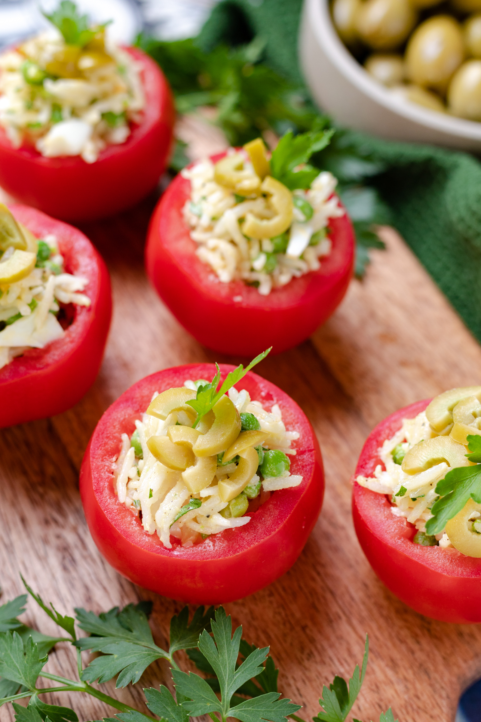 Ze zijn geïnspireerd op de Argentijnse ‘tomates rellenos’, de gevulde tomaten die in Argentinië veelvuldig worden geserveerd tijdens de zomermaanden. Daar vullen ze de tomaten met van alles. Ik koos er zelf voor om ze te vullen met een frisse rijstsalade met onder andere ei, doperwten, mayonaise en citroen. Je kunt er trouwens ook nog wat tonijn of zalm uit blik aan toevoegen, ook een heerlijke combi.