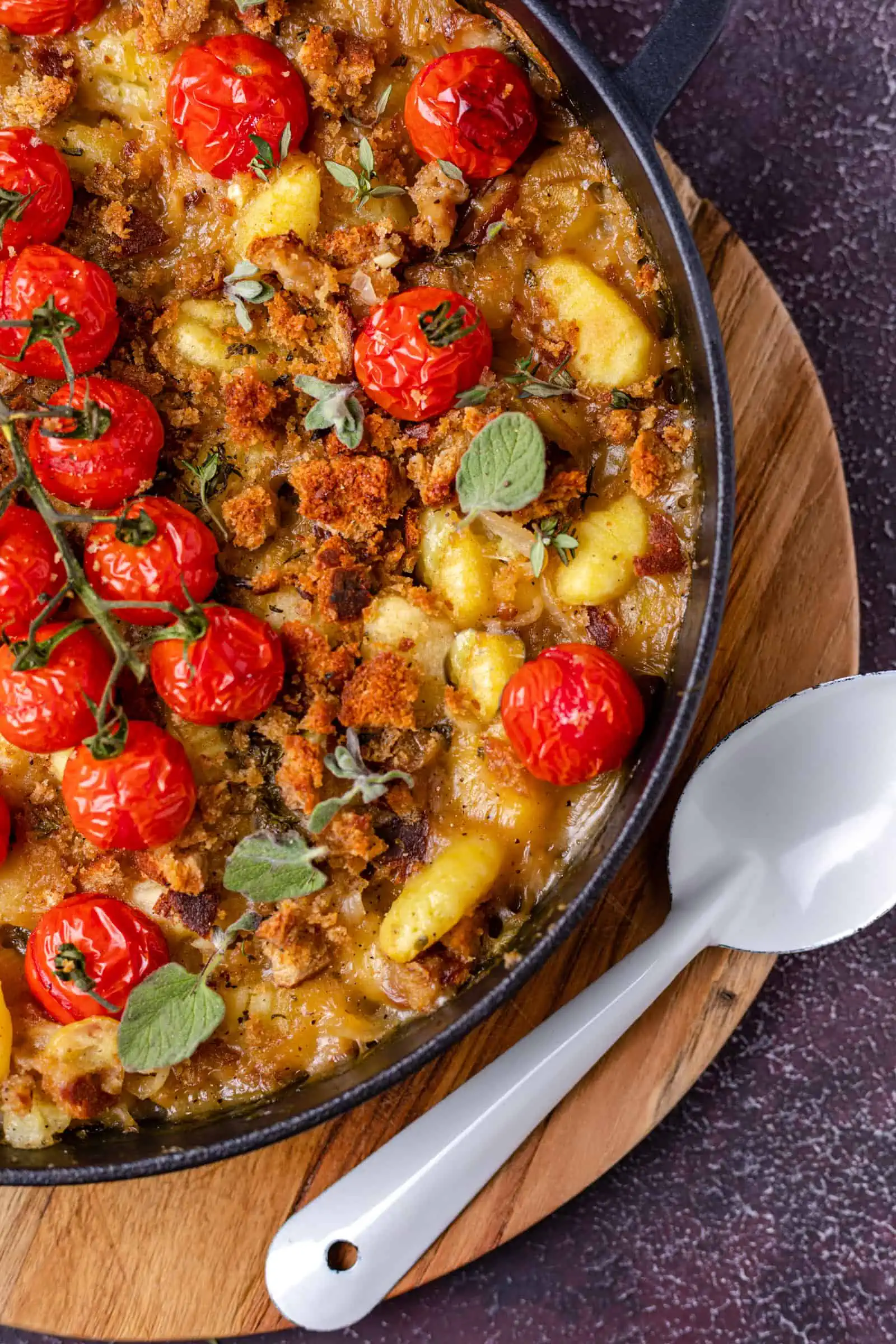- Strooi na 25 minuten de broodkruimels over de gnocchi en verdeel de honingtomaten erover. Zet nog 5 minuten in de oven en check of de saus goed gebonden is (gaat vanzelf door het zetmeel van de gnocchi). Zo niet: dan heeft de gnocchi nog 5 – 10 minuten nodig. Zet op het laatst de grill nog even aan voor een mooi bruin korstje.