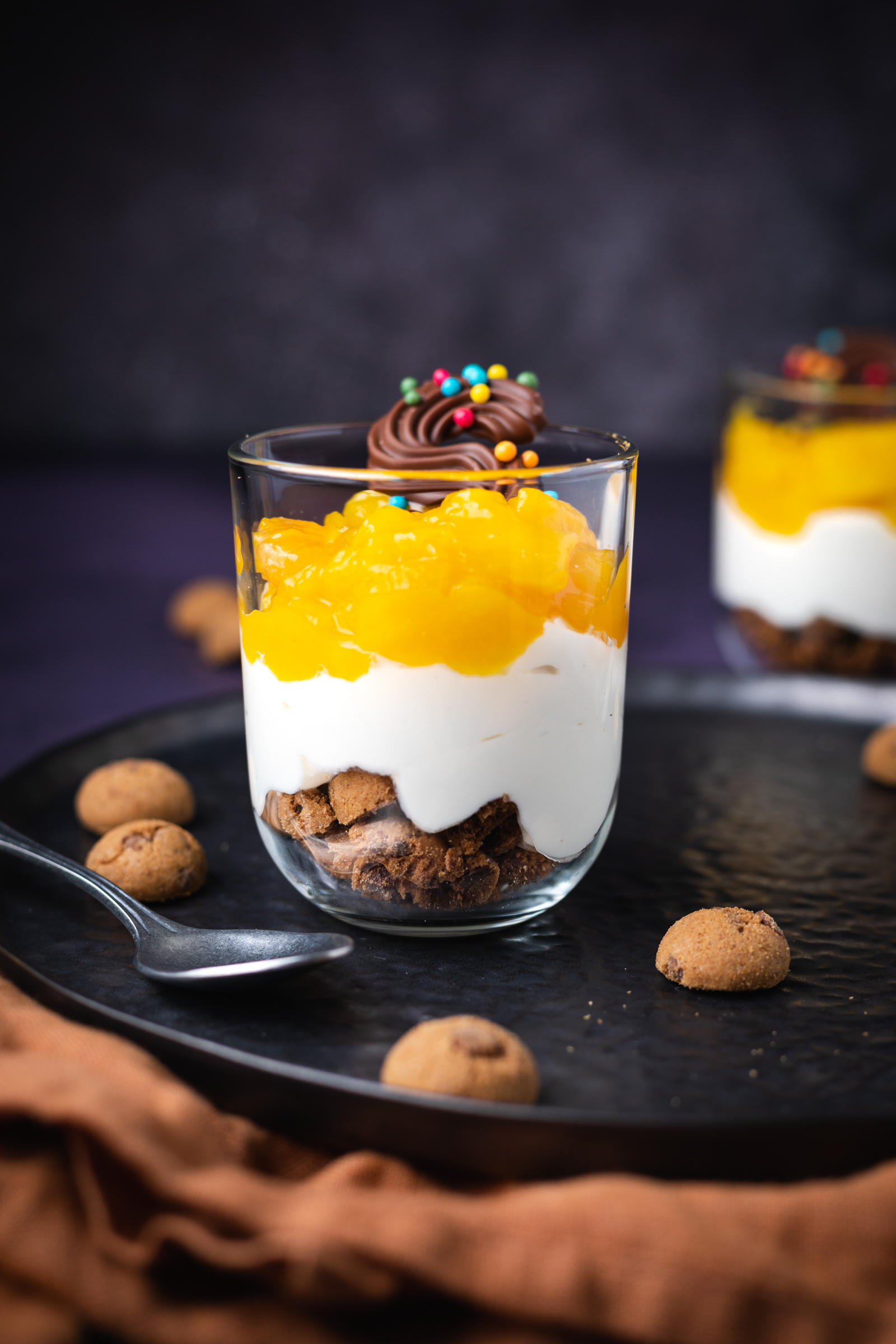 Voor de bodem gebruikte ik de kruidnoten met Milka en Bastogne, die zo lekker zijn dat je er beter twee zakken van kunt kopen. En nee, dit is niet gesponsord, we zijn er gewoon heel enthousiast over ;-). Voor de topping van het kruidnotentoetje maakte ik een compote van mangoblokjes uit de vriezer met wat mandarijnsap. En de Griekse yoghurt hoef je alleen maar even op te kloppen met wat honing. Kind kan de was doen en je bent er zo mee klaar!