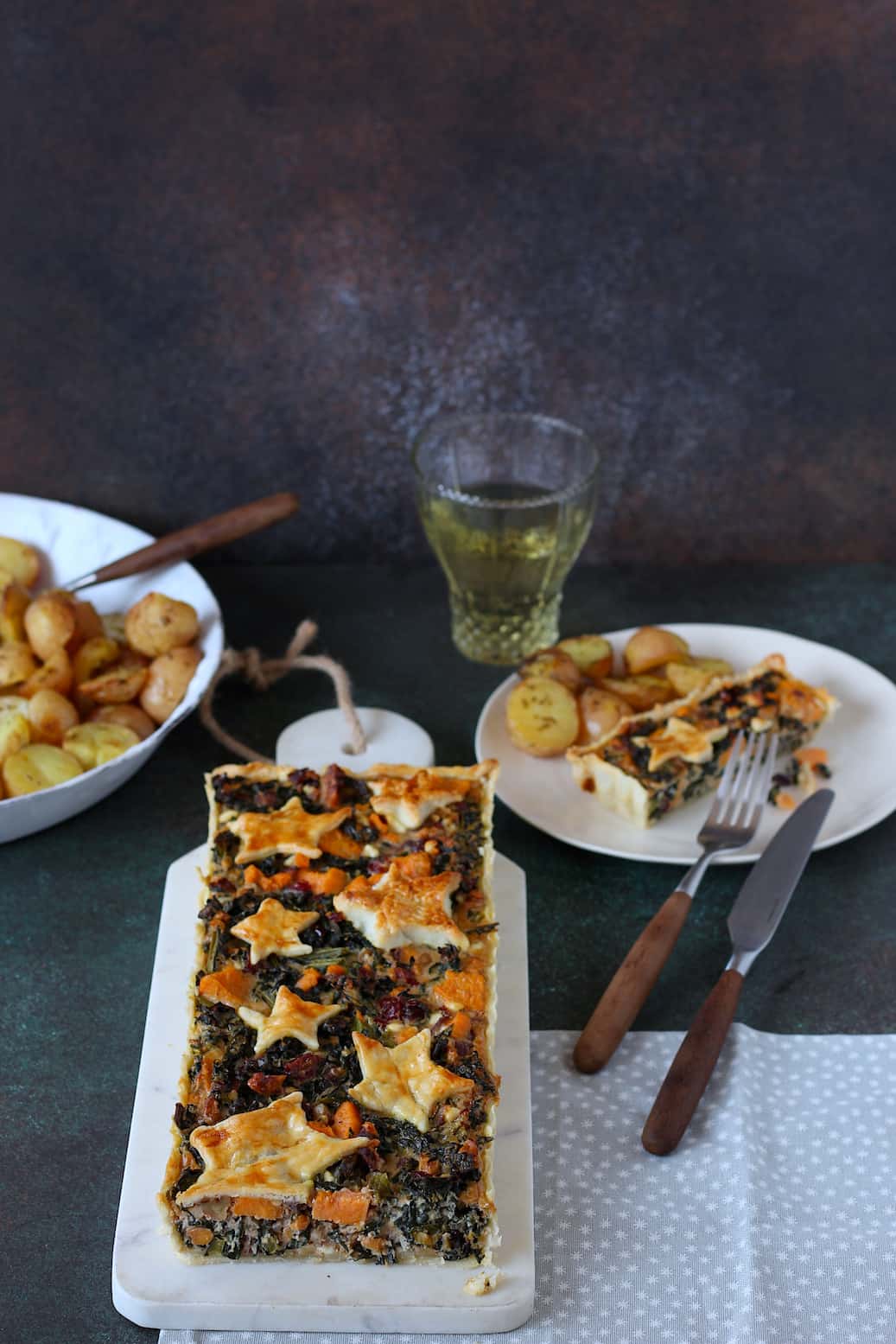 Ook als je voor een vegetarisch hoofdgerecht gaat, kun je iets moois op tafel zetten tijdens het kerstdiner. Deze groentetaart met geroosterde aardappelen bijvoorbeeld! Qua voorbereiding kun je voor dit gerecht de aardappels een dag eerder voorkoken, bak ze pas vlak voor het diner af. De groentetaart kun je een dag eerder bereiden en weer opwarmen in de oven vlak voor het diner.