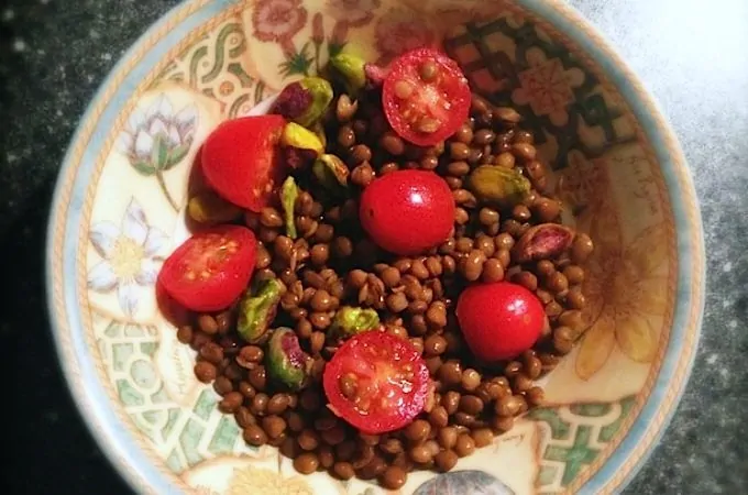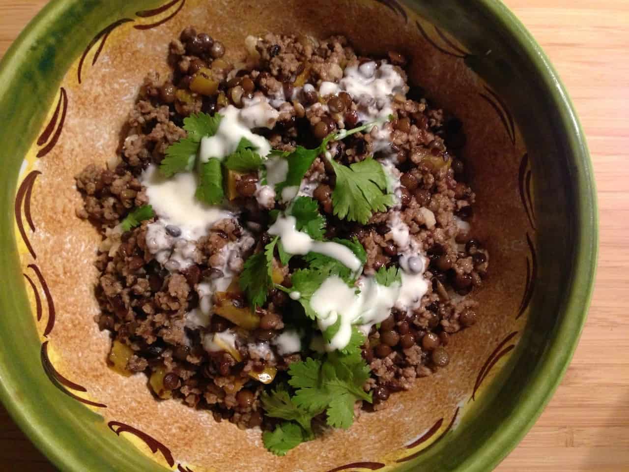 Lamsgehakt met linzen, koriander en zilvervliesrijst