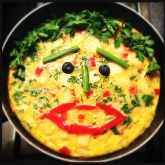 En als je dan toch bezig bent, kun je net zo goed gelijk een leuk gezichtje op die frittata maken 😉