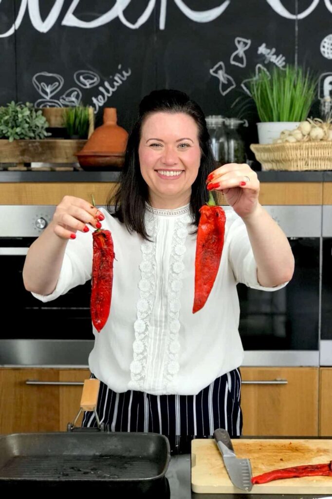 1. Begin met het roosteren van de paprika. Leg deze op de grillplaat (of barbecue) en laat aan alle kanten zwart blakeren. Even afkoelen (eventueel in een gesloten plastic zak) en daarna trek je het vel er zo af. Snijd daarna in reepjes.