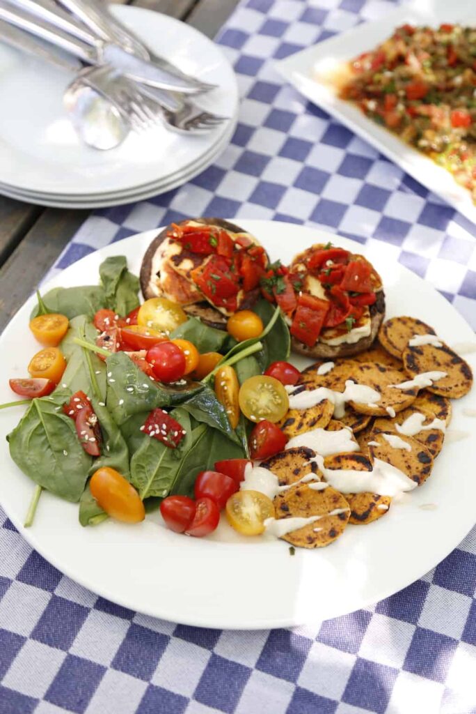 6. Na 10 minuten grillen is alles klaar. Beleg de portobello’s met haloumi en een royale schep van de paprikasalsa. Leg op een bord met een deel van de plakken zoete aardappel en serveer met een groene salade. Wij combineerden daarvoor bladspinazie met olijfolie extra vergine, gehalveerde cherrytomaten, citroenrasp en geroosterd sesamzaad.