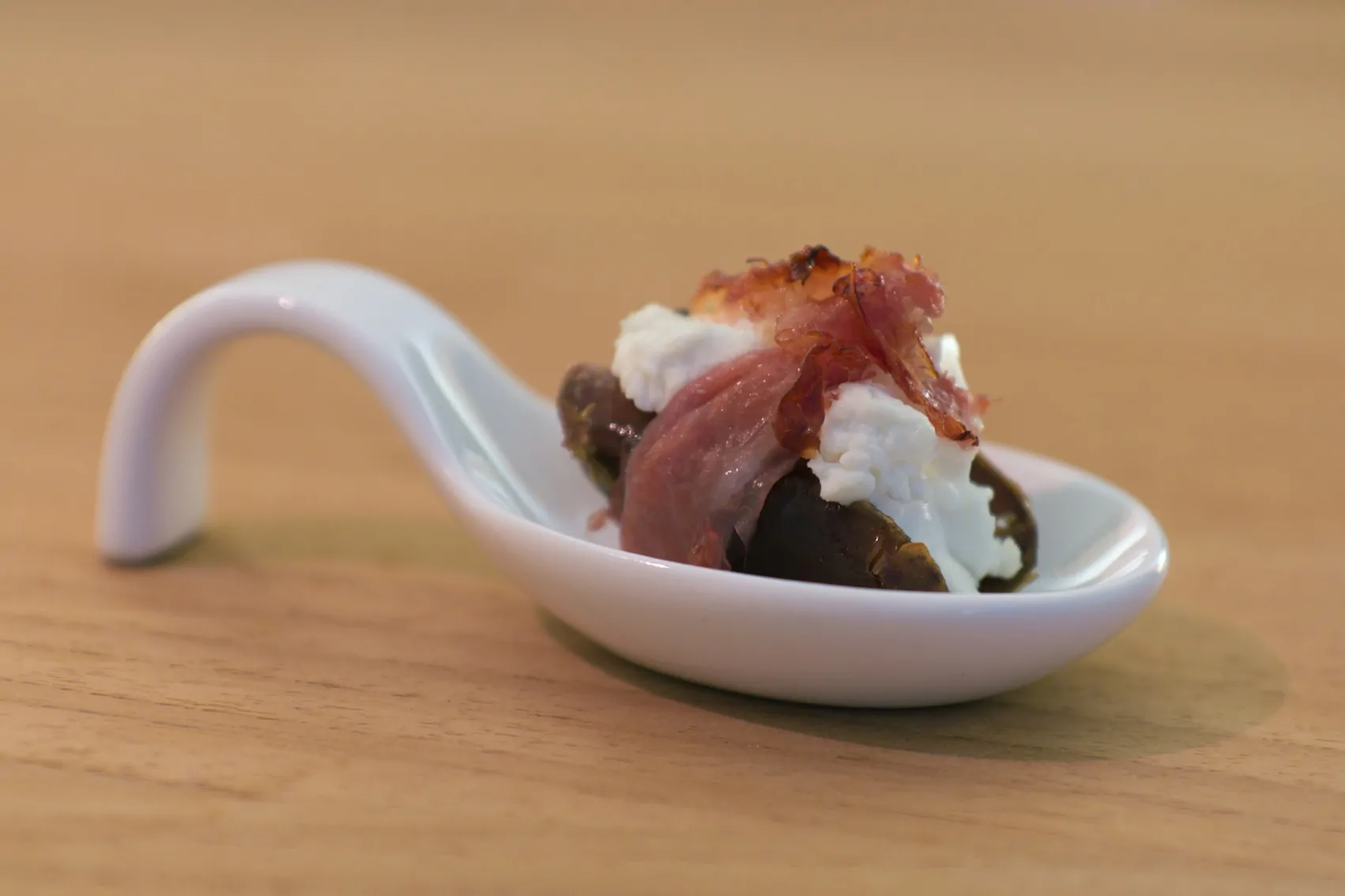Verwarm de grill voor. Snijd een dadel in de lengte open zodat je die open kunt klappen. Laat de dadel aan de onderkant heel. Schep een dotje geitenkaas in de dadel. Rol een dun plakje ham op, of snijd een plakje ham in een mooi dun reepje, en bind hiermee de dadel bijeen. Probeer de ham aan de bovenkant samen te knijpen (of te draaien) tot een strikje of knoopje. Zo blijft alles mooi zitten. Plaats de gevulde dadels onder de grill en blijf erbij, het hoeft maar heel even. Houd de ham in de gaten: als die krokant is, zijn je amuses klaar. Serveer ze direct uit de grill, ze zijn dan nog lauwwarm en de ham is heerlijk krokant. Presenteer ze op een amuselepel. Eet smakelijk!