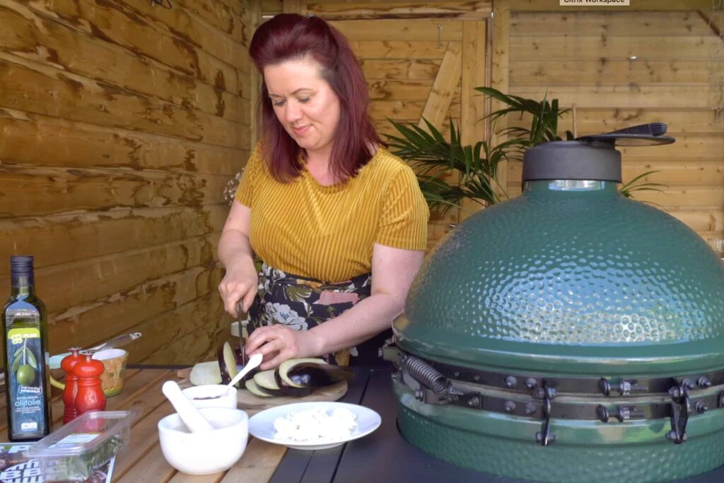 - Snijd de aubergines in lange plakken, kwast ze in met bakolijfolie en grill ze daarna helemaal zacht op het rooster van de barbecue. Hak de aubergine daarna in grove stukken.