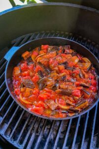Gestoofde aubergine van de barbecue met tomaat, knoflook en rozemarijn