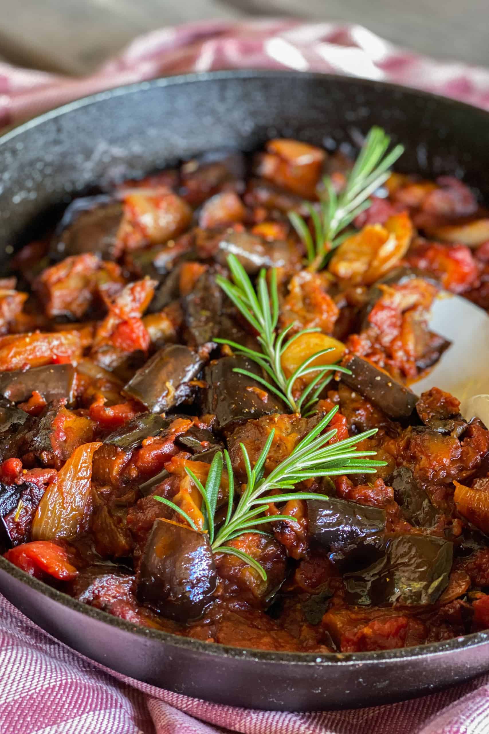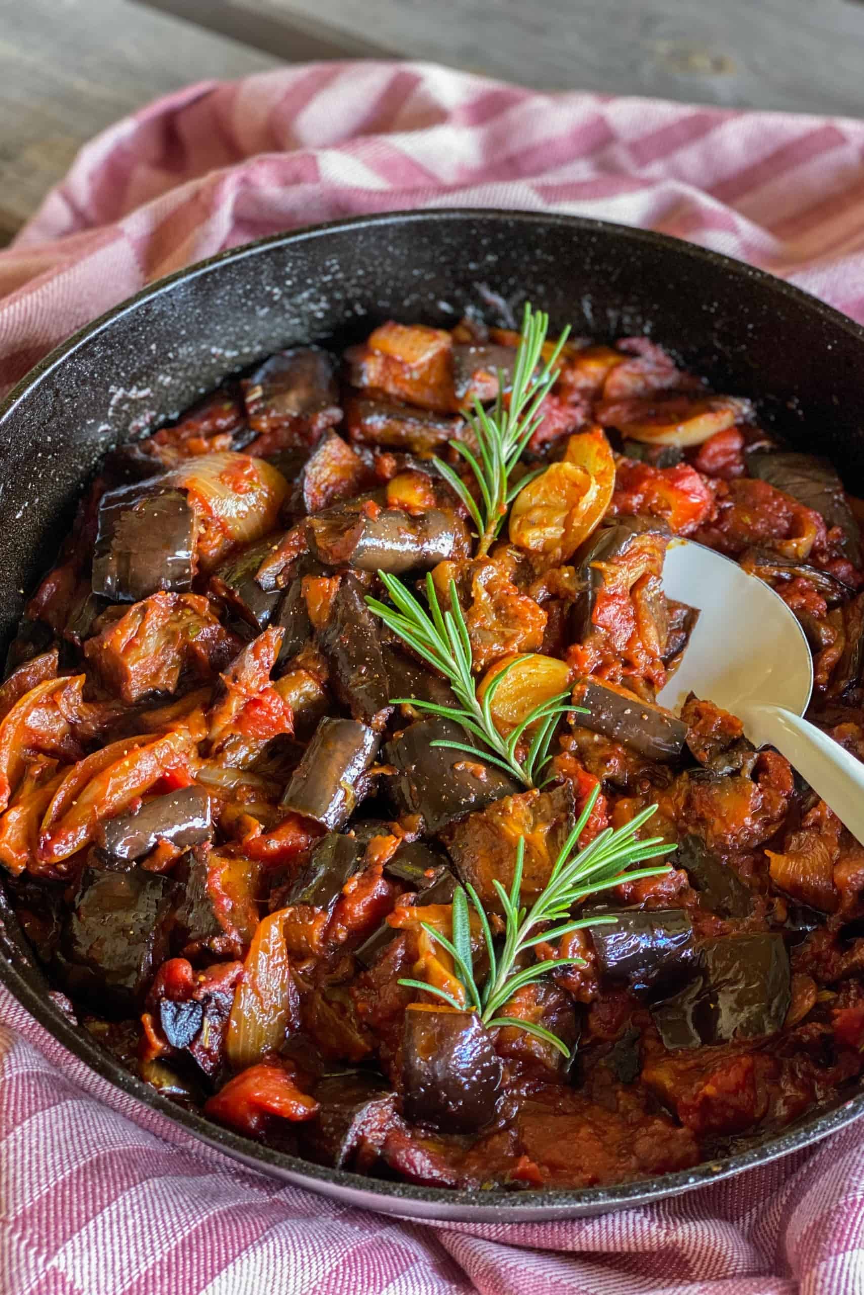 Leonie daagde me uit om ook een twist te maken op haar recept. Daarvoor gebruikte ik uiteraard aubergine en aangezien ik nog rozemarijn over had, heb ik die ook verwerkt in mijn recept. Mijn gestoofde aubergine met tomaat, knoflook en rozemarijn werd echt zalig en we hebben ervan gesmuld. Zet de schaal gewoon op tafel en serveer er knapperig stokbrood bij waarmee je lekker in de saus kunt dopen. Genieten!