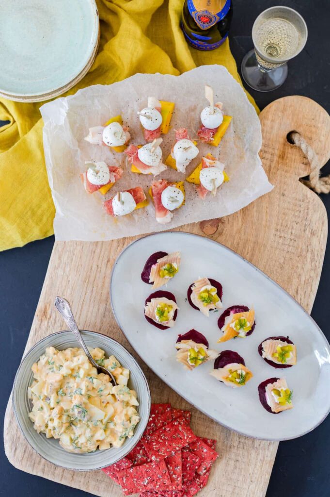 In dit artikel vind je de recepten voor een luxe eiersalade, bietentoast met gerookte forel en augurk en spiesjes met mango, parmaham, mozzarella en zwarte peper. Geniet ervan en ik wens je al het moois voor het nieuwe jaar!