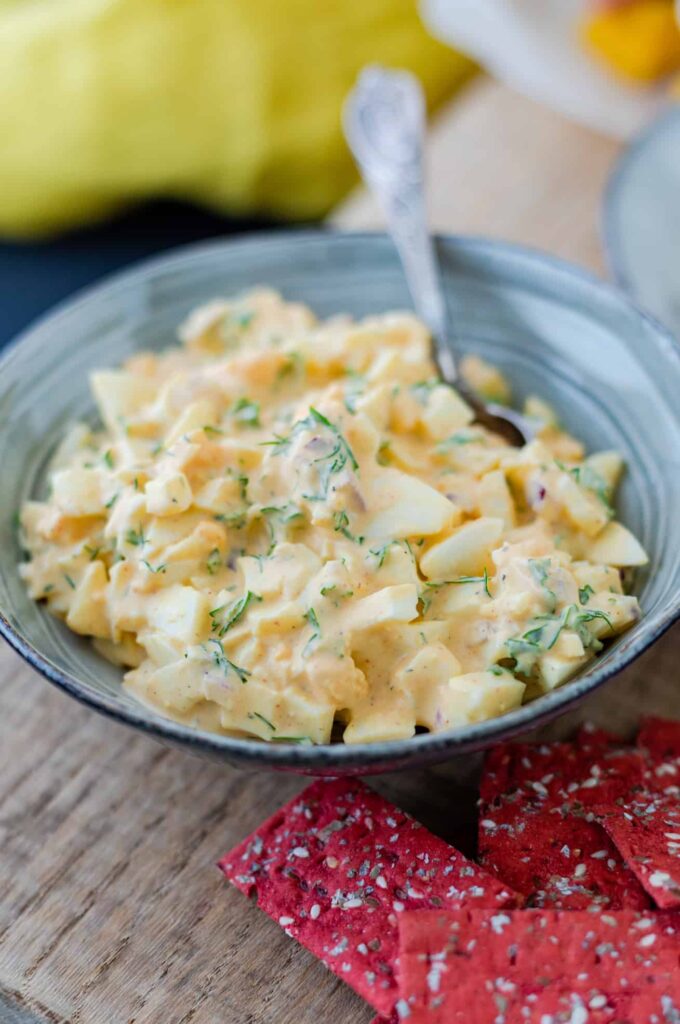 - Schep de eieren voorzichtig om met het mayonaisemengsel en zet afgedekt in de koelkast tot gebruik.