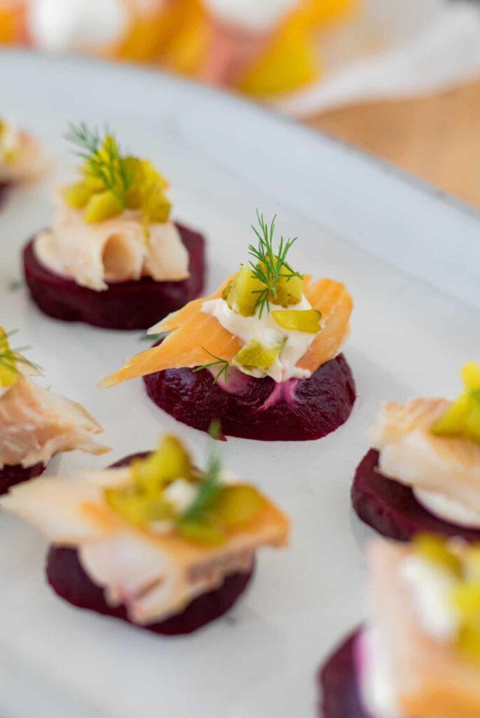 - Snijd de forel in stukjes en beleg ieder plakje biet met wat forel.