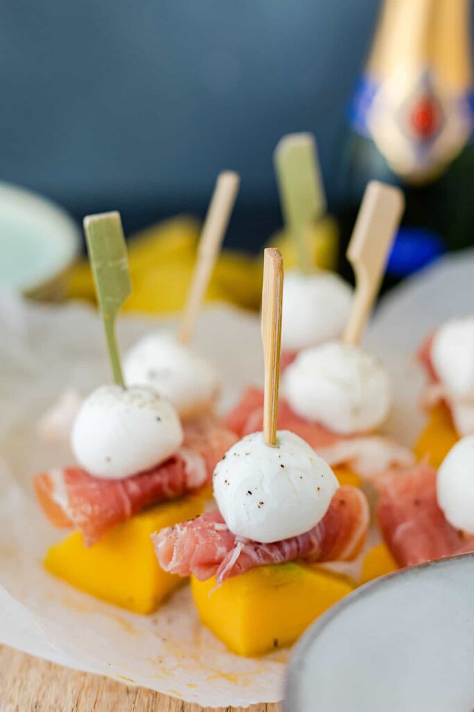 - Rijg aan ieder prikkertje een stukje mango, een opgerold plakje parmaham en een mozzarellabolletje.