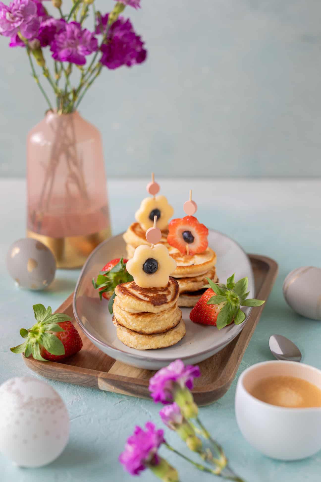 - voor de garnering van de bloemetjes pancakes: aardbei, appel, blauwe bessen en houten prikkertjes