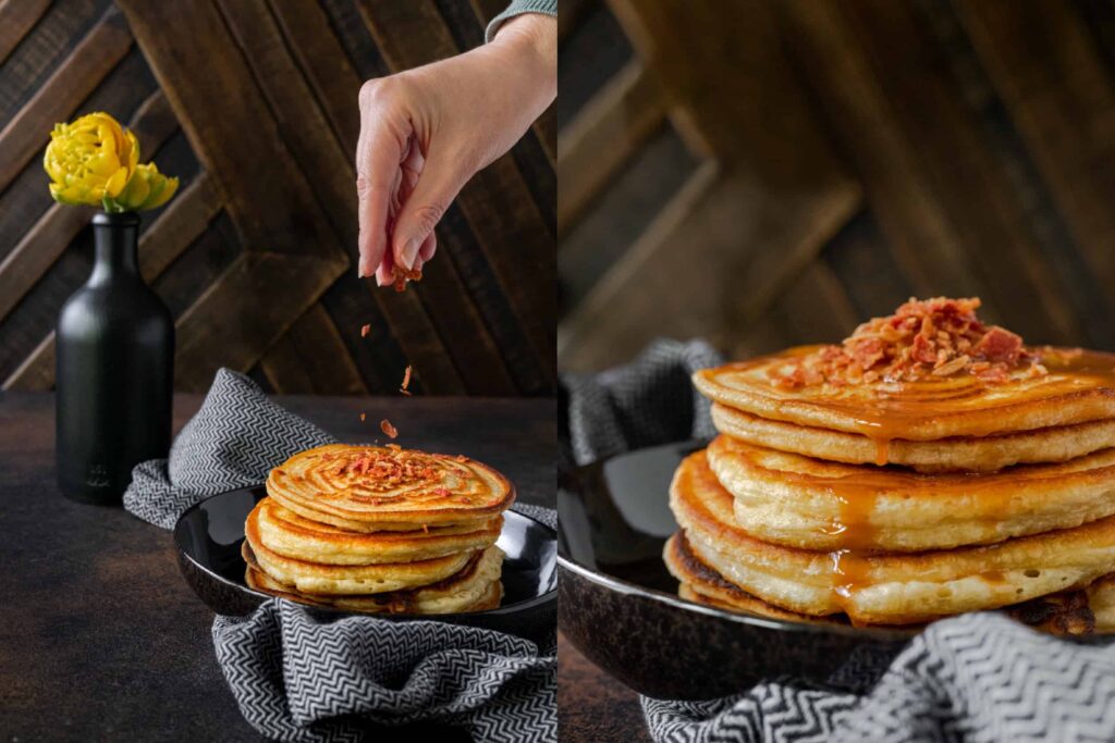 8. Decoratie van de pancakes met karamel en bacon: Maak een stapel van de 6 pancakes op een bord. Schenk de karamelsaus erover en garneer royaal met de krokante bacon.