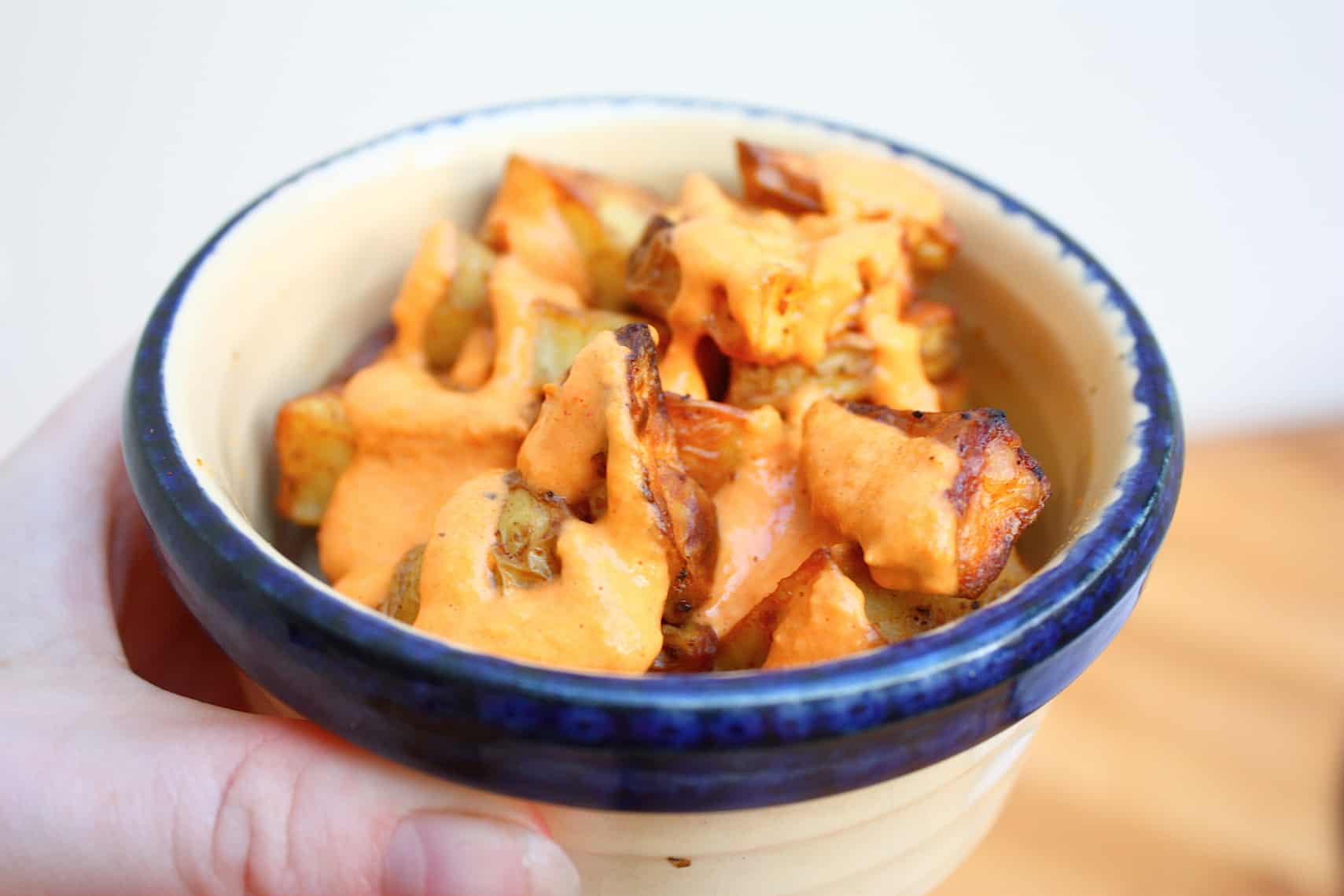 6. Haal de aardappeltjes uit de oven en serveer in schaaltjes met de saus eroverheen.