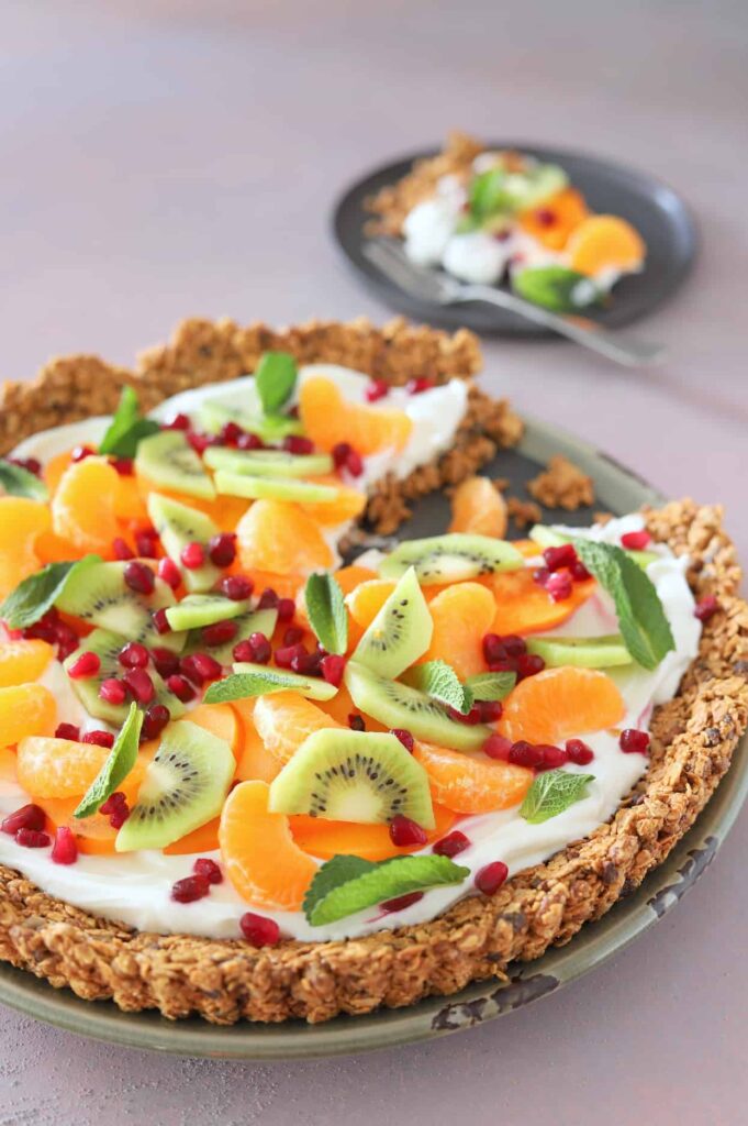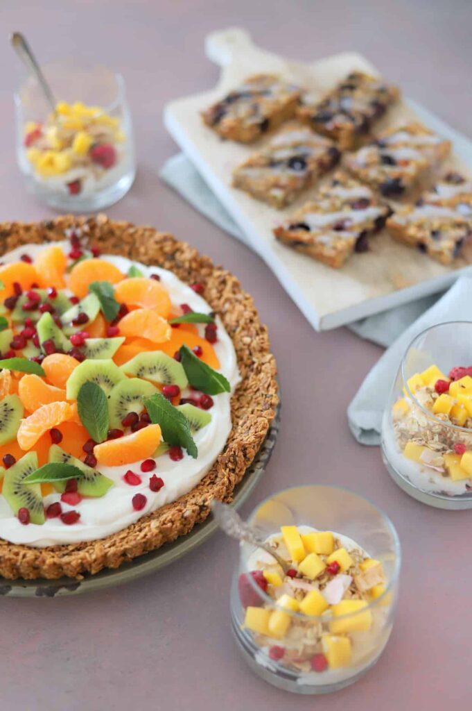 - Vlak voor het serveren (niet voorbereiden en in de koelkast zetten, want dan wordt de bodem zacht) haal je de taartbodem uit de koelkast of vriezer en vul je ‘m tot 2/3 met de Griekse yoghurt. Je zal niet alles nodig hebben van de 500 gr, maar dat komt vast wel op. Garneer de ontbijttaart op je allermooist met het verse fruit en de blaadjes verse munt en serveer direct.