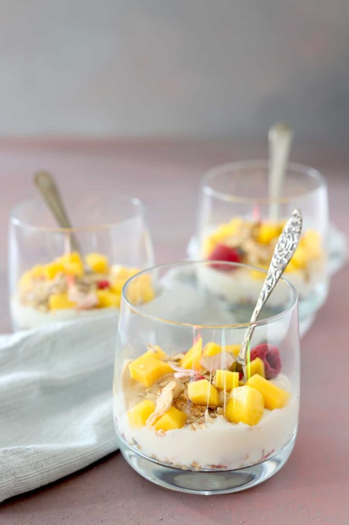 Ik hou enorm van een trifle als dessert, maar hiermee kun je ook heerlijk ontbijten. Met bevroren banaan en mango maak je in een handomdraai een heerlijke granola ontbijt trifle. Deze kun je zelfs helemaal vegan maken als je je granola bakt zonder honing, maar met bijvoorbeeld ahornsiroop. Bereid dit wel even goed voor door alvast banaan in te vriezen. Heb je overrijpe bananen in de fruitschaal liggen? Haal deze dan uit de schil en snijd ‘m in grove stukken. Vries deze vervolgens in en dan heb je een perfecte basis voor een smoothie of deze ontbijt trifle.