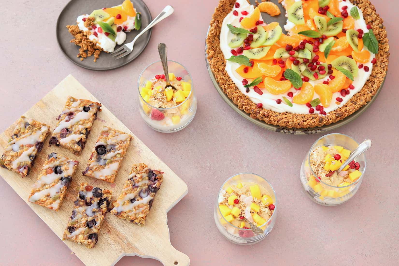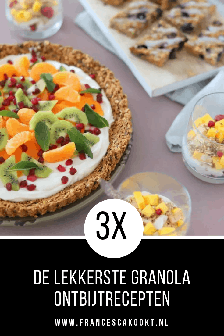 Dat ontbijten met granola een goed idee is, weten we al met z’n allen. Sterker nog, het basisrecept voor mijn granola wordt al jaren flink door jullie bekeken, en gemaakt! Nu met Pasen in aantocht leek het mij en Debbie een goed idee om eens te variëren met granola ontbijtrecepten en we hebben 3 feestelijke recepten voor jullie bedacht: bosbessen granola ontbijtrepen, een granola ontbijt trifle met mango en banaan en een feestelijke granola ontbijttaart. Dat wordt smullen!