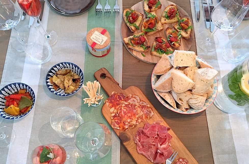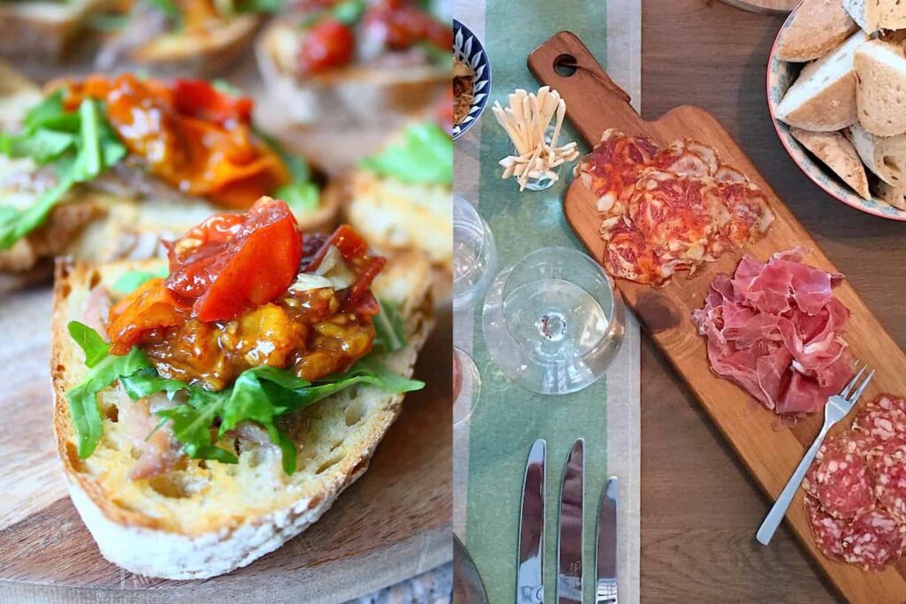 Maak bijvoorbeeld bruschetta’s met boter, ansjovis, rucola en balsamico tomaatjes of een van deze andere bruschetta recepten. Zet sowieso goed brood met olijfolie extra vergine en gezouten boter op tafel naast bakjes met lekkere olijven. En vergeet de Italiaanse charcuterie niet! Denk aan prosciutto, bresaolo en mortadella bijvoorbeeld.