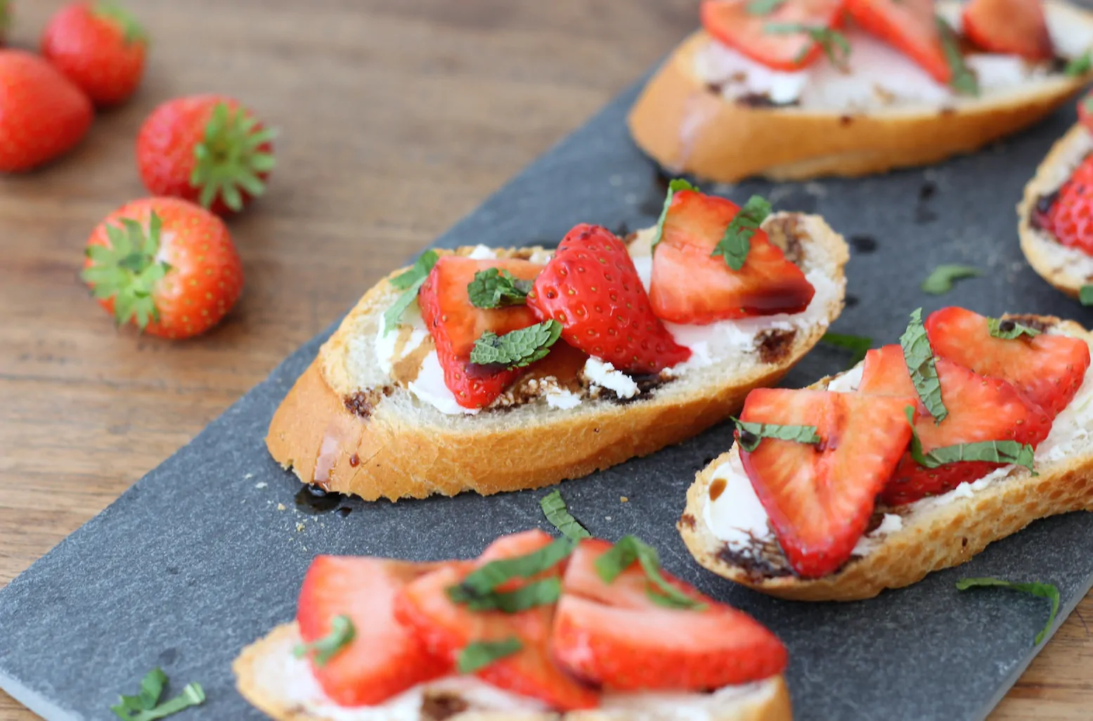 Besmeer vlak voor het serveren de crostini met een dun laagje geiten- of roomkaas en beleg met plakjes aardbeien. Druppel wat balsamicodressing erover en garneer met reepjes munt. Serveer direct. Tip voor de liefhebbers: strooi er op het einde ook nog een klein snufje gemalen zwarte peper over.