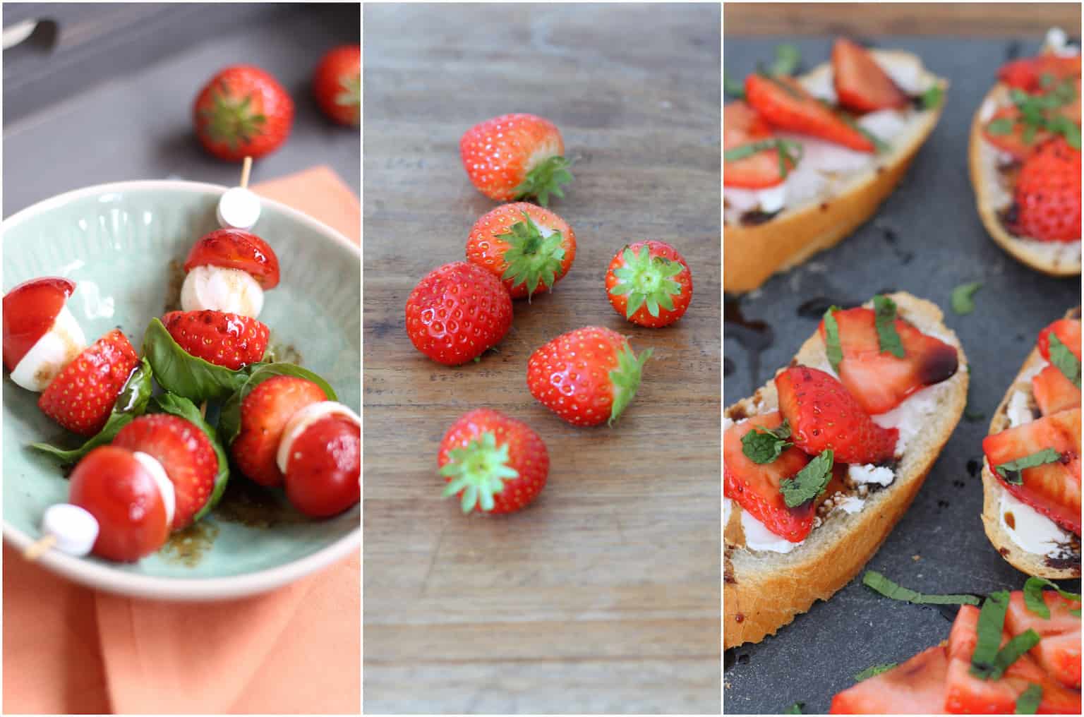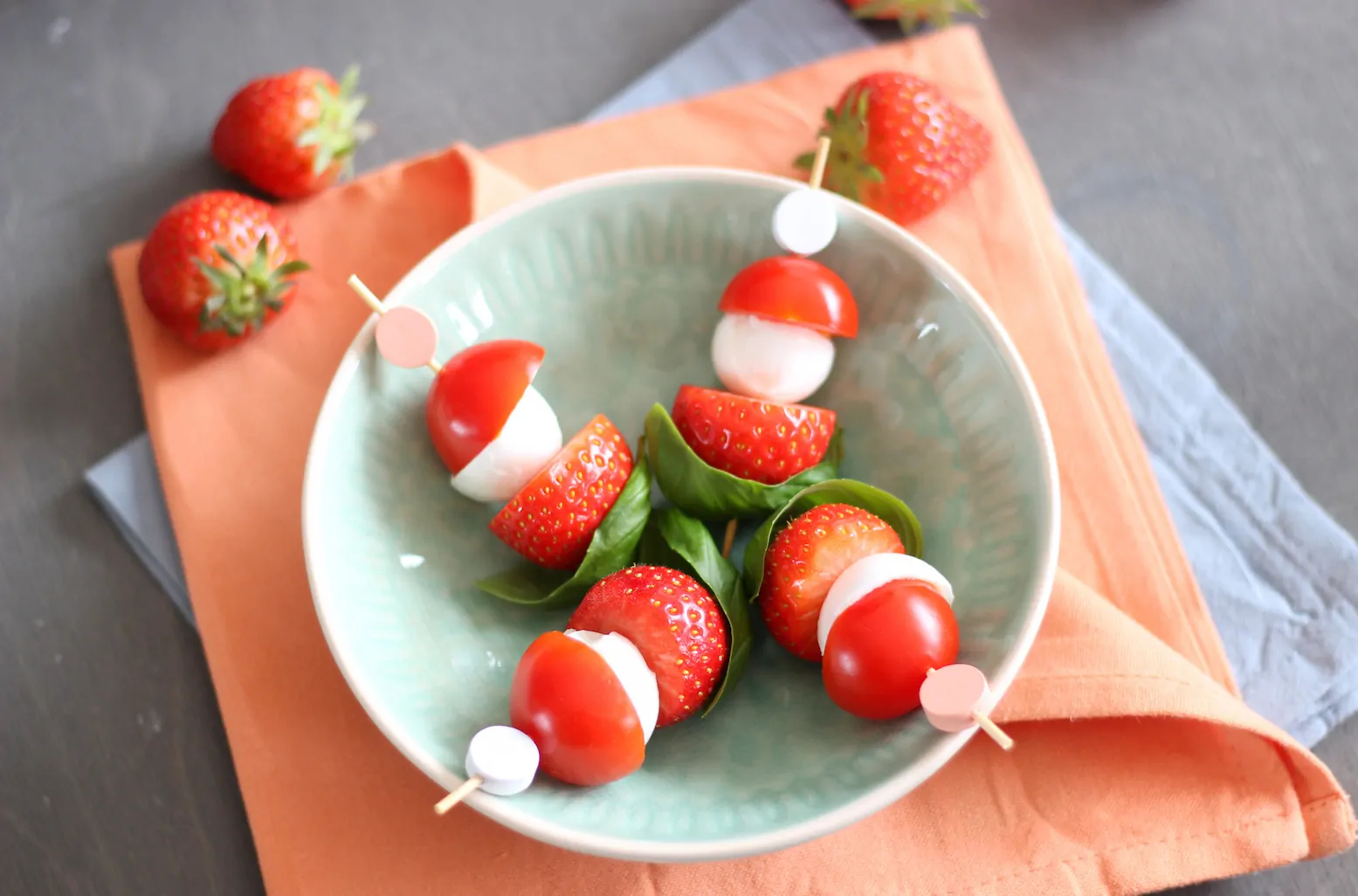 Halveer de cherrytomaten en de mozzarellabolletjes. Verwijder de kroontjes van de aardbeien. Rijg aan ieder prikkertjes een gehalveerde cherrytomaat en mozzarellabolletjes, een aardbei en blaadje basilicum.
