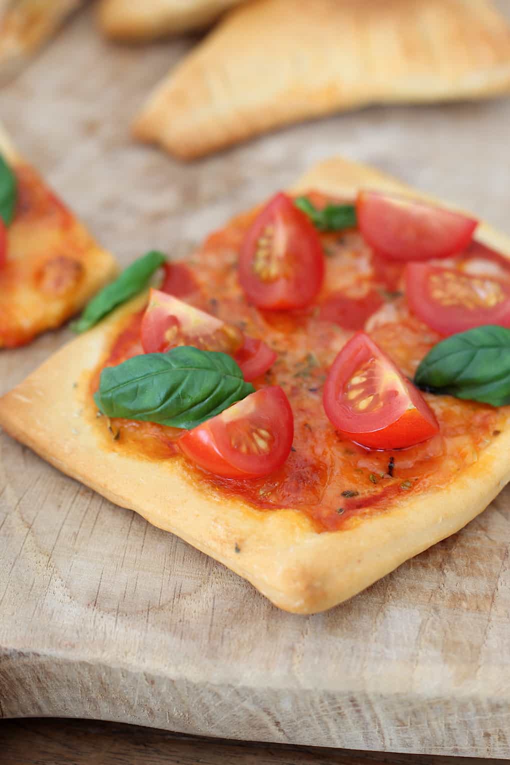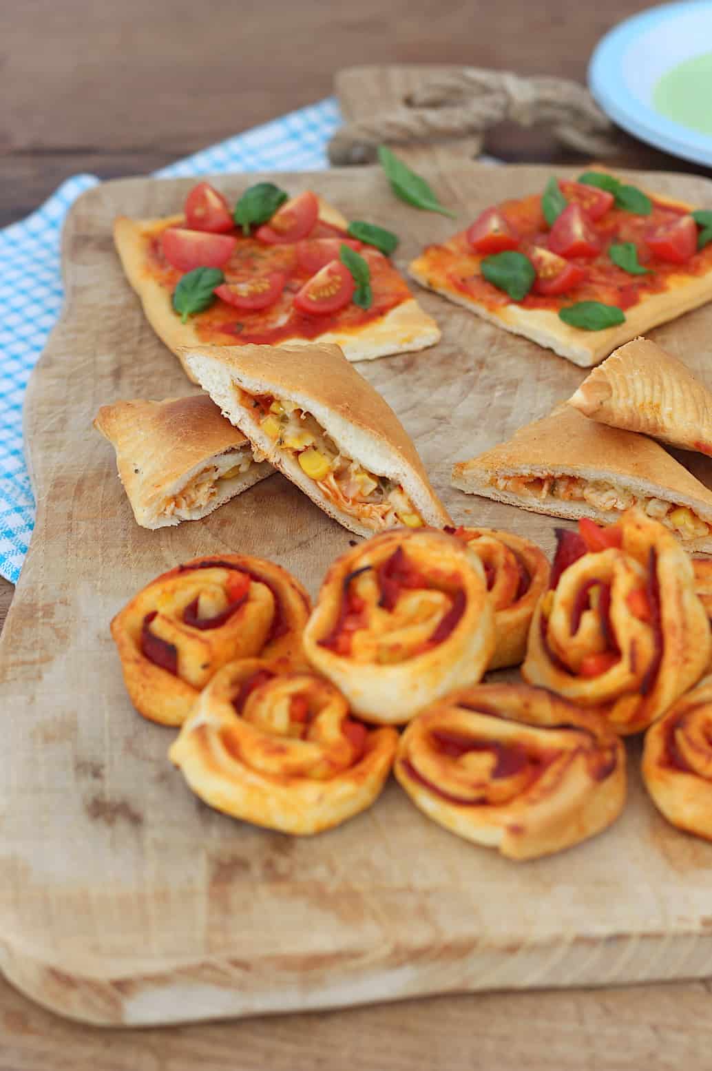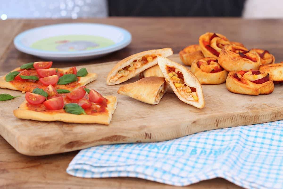 Variatietip: Je kunt de verschillende pizzasnacks ook tegelijkertijd maken zoals ik deed op de foto. Uit 1 rol pizzadeeg haalde ik 8 pizzarolletjes, 2 Margherita vierkantjes en 2 calzones. Of geef je kinderen vrij spel en zet alleen het uitgerolde deeg en verschillende (gesneden) ingrediënten voor ze klaar. Laat ze vervolgens hun eigen snacks bedenken. Daar kunnen hele verrassende en lekkere dingen uit komen! Of niet, maar dat is ook niet erg 😉