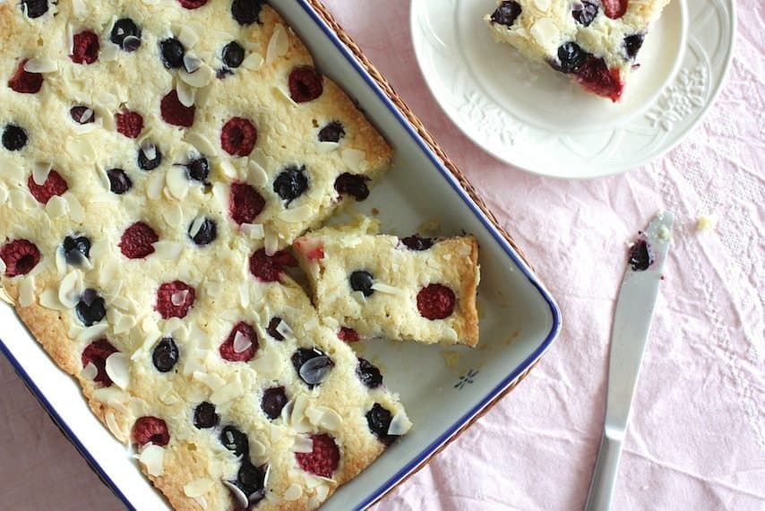 Nog iets lekkers bakken? Maak dan deze plaatcake met bosbessen en frambozen.