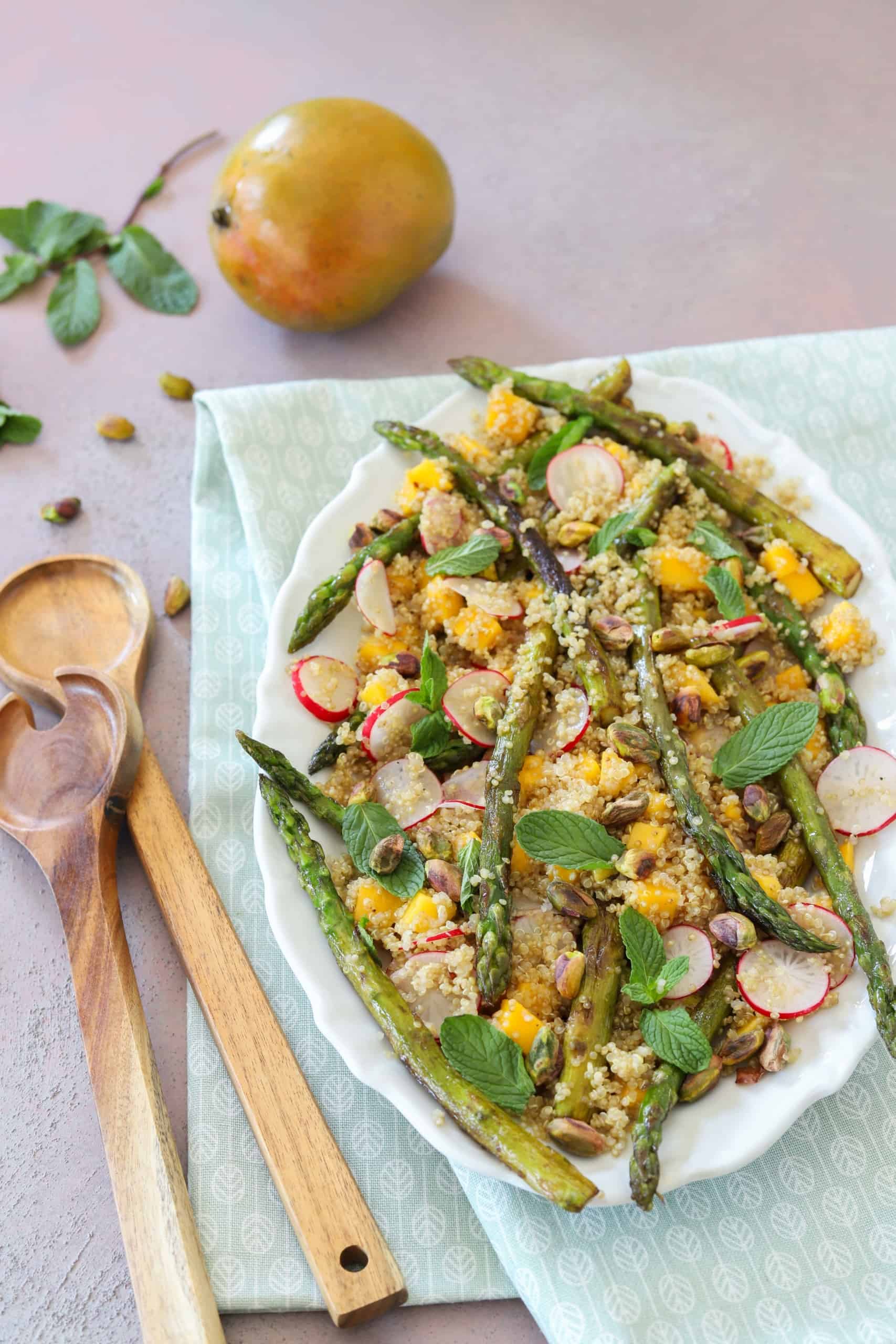 Quinoasalade met groene asperges, radijs, mango en pistache