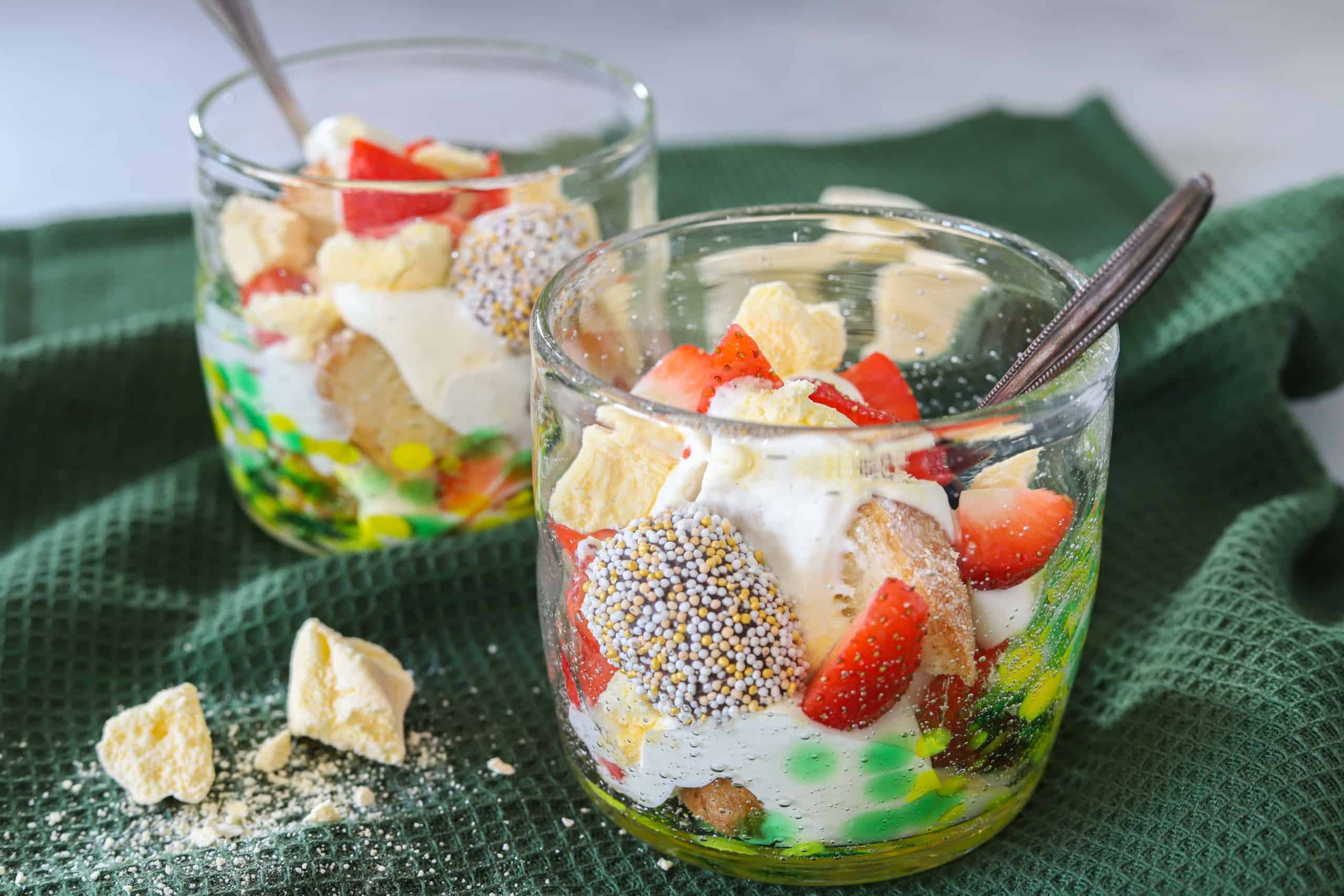 Trifle met aardbeien, tulband, vanilleroom en paaschocolade