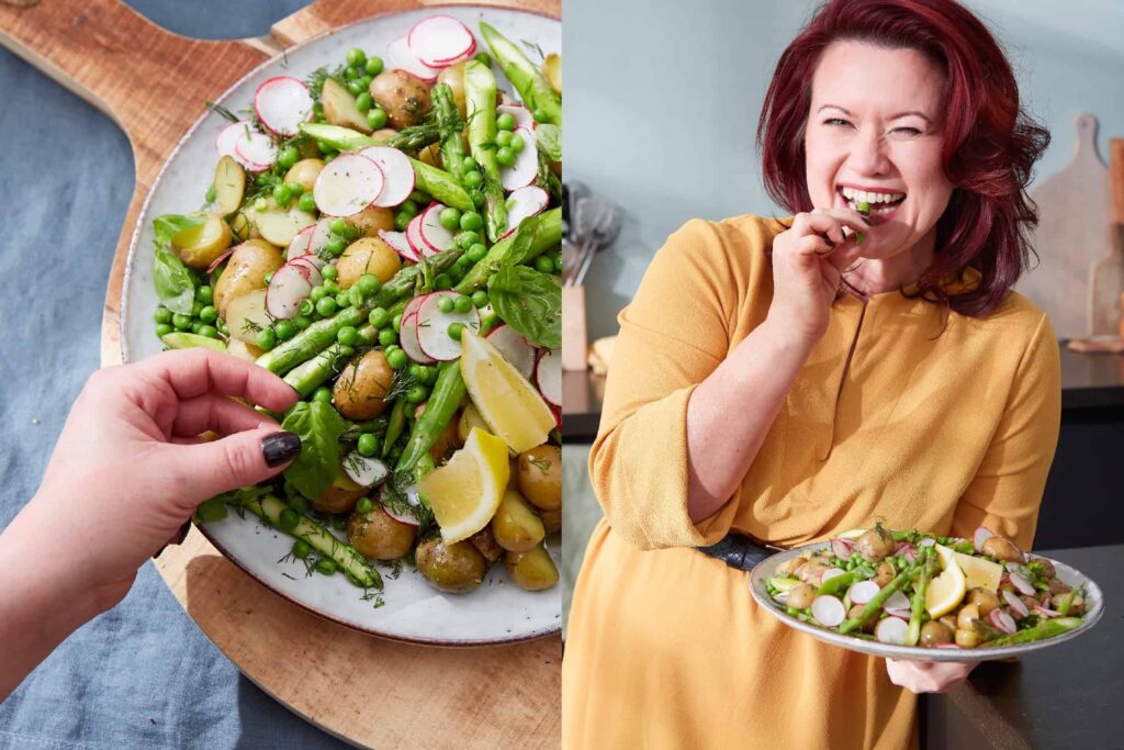 - Snijd de radijsjes in dunne plakjes. Schenk wat olijfolie extra vergine en appelciderazijn bij de krieltjes in de pan. Daarna gaan de asperges, doperwten en radijs erbij. Maak op smaak met wat zeezout en zwarte peper. Hussel het door elkaar en laat 2 min. staan.