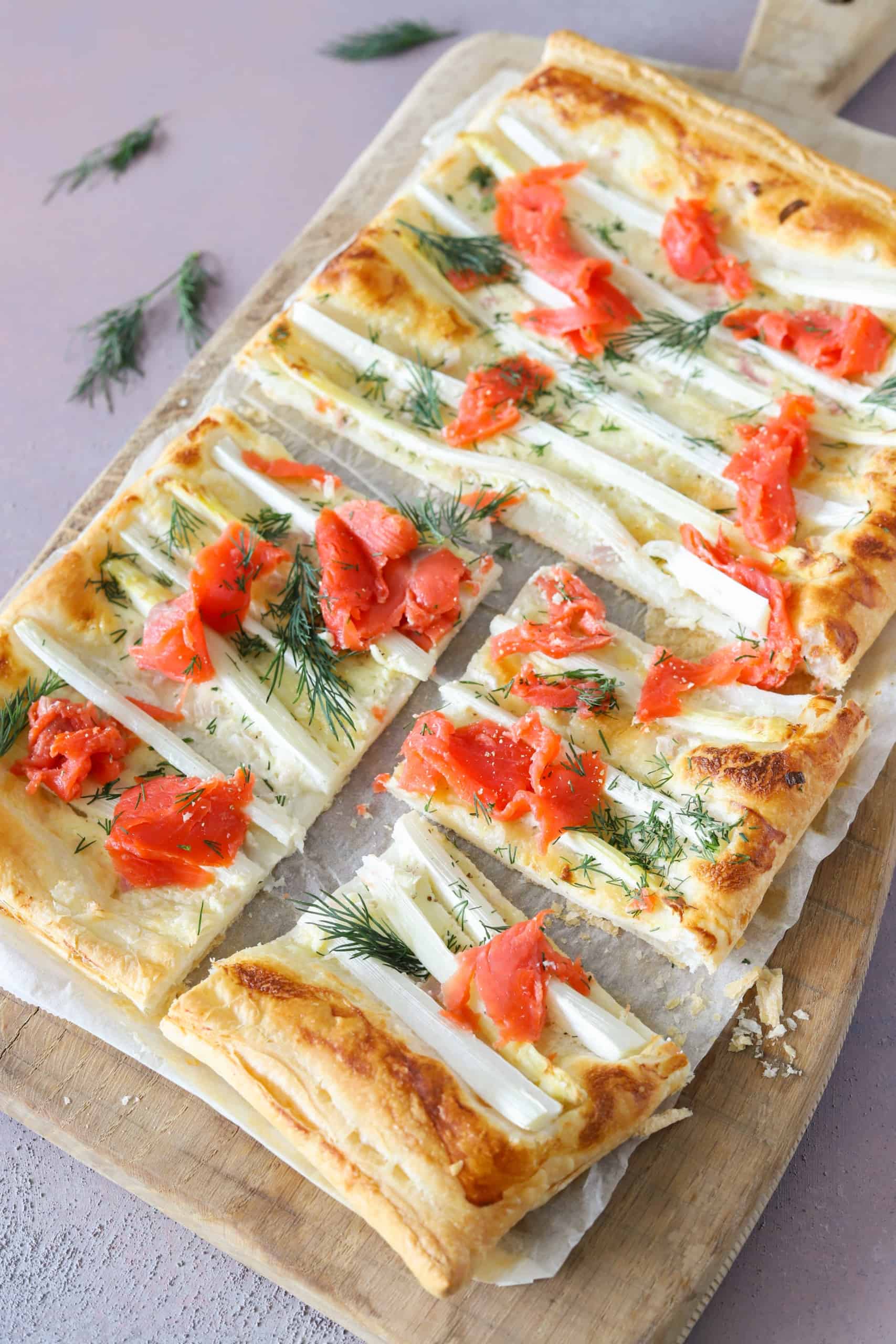 Plaattaart met Hollandse asperges, gerookte zalm en dille