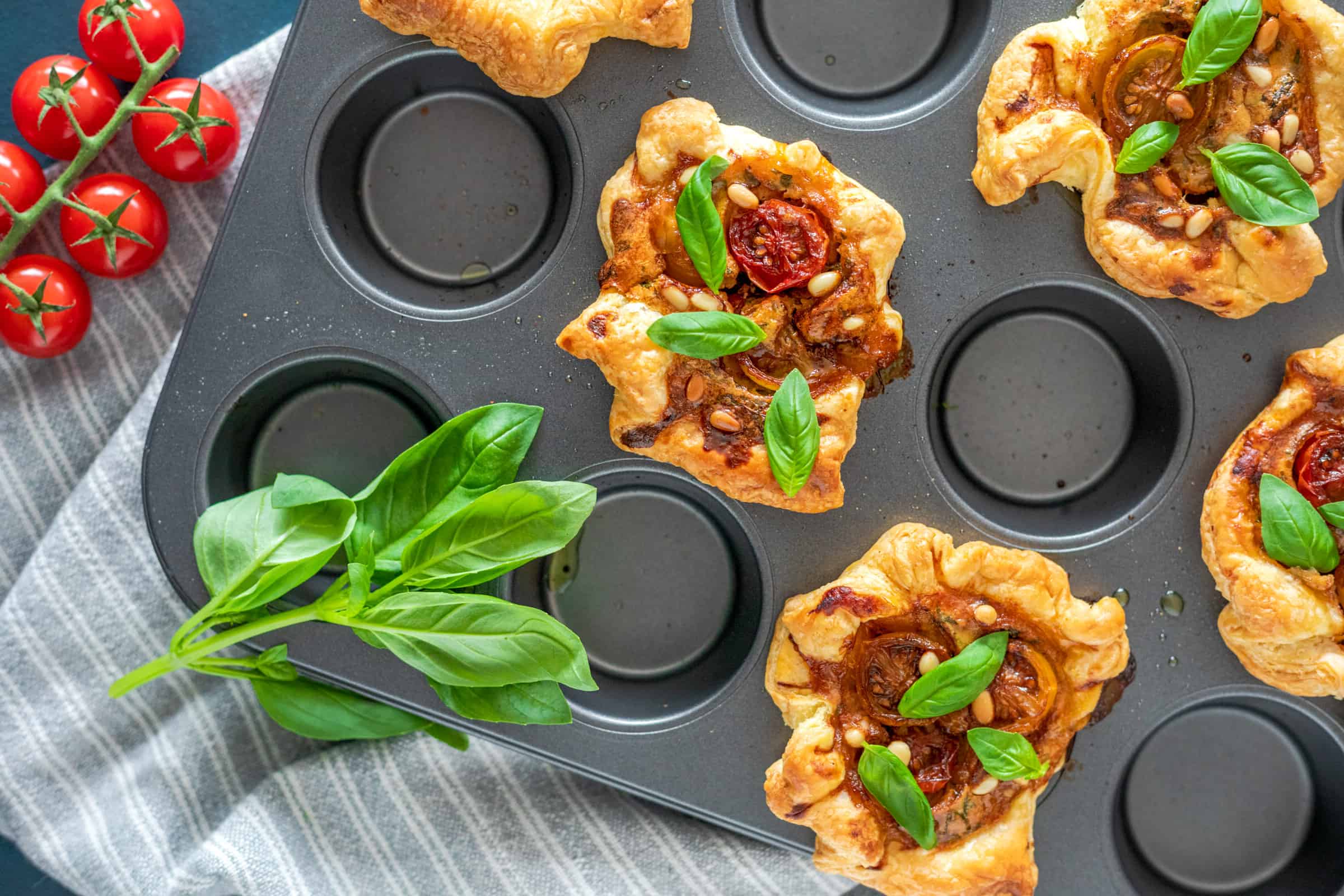 Als je een pakje met bladerdeeg in de diepvries hebt liggen, kun je eigenlijk altijd wel in een handomdraai een lekker hartig hapje maken. Vaak gewoon met ingrediënten die je al in huis hebt en kliekjes. Zo maakte ik deze bladerdeegtaartjes met cherrytomaten, Griekse yoghurt, slagroom, eieren en balsamico.