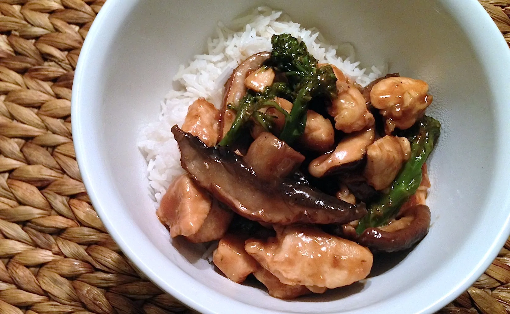 Kip met kortgebakken broccoli en paddenstoelen en een rijke hoisin saus.