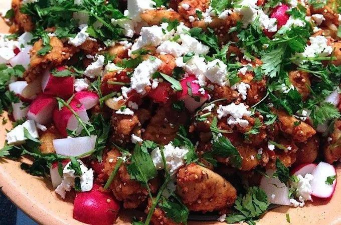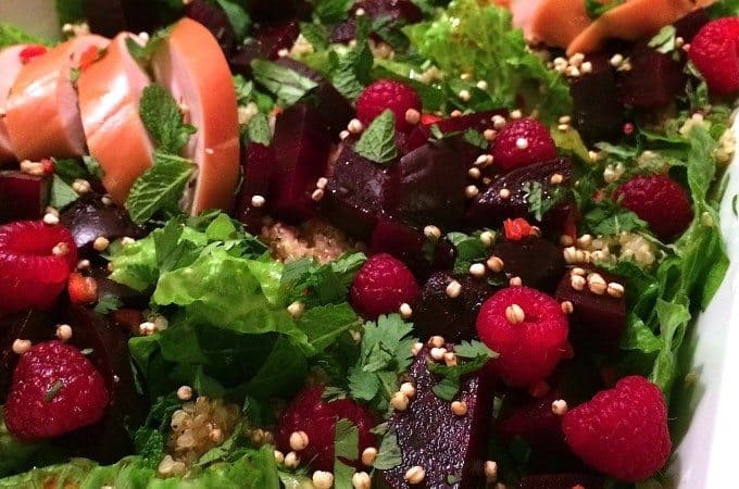 Quinoa salade met rode biet, frambozen en gerookte kip