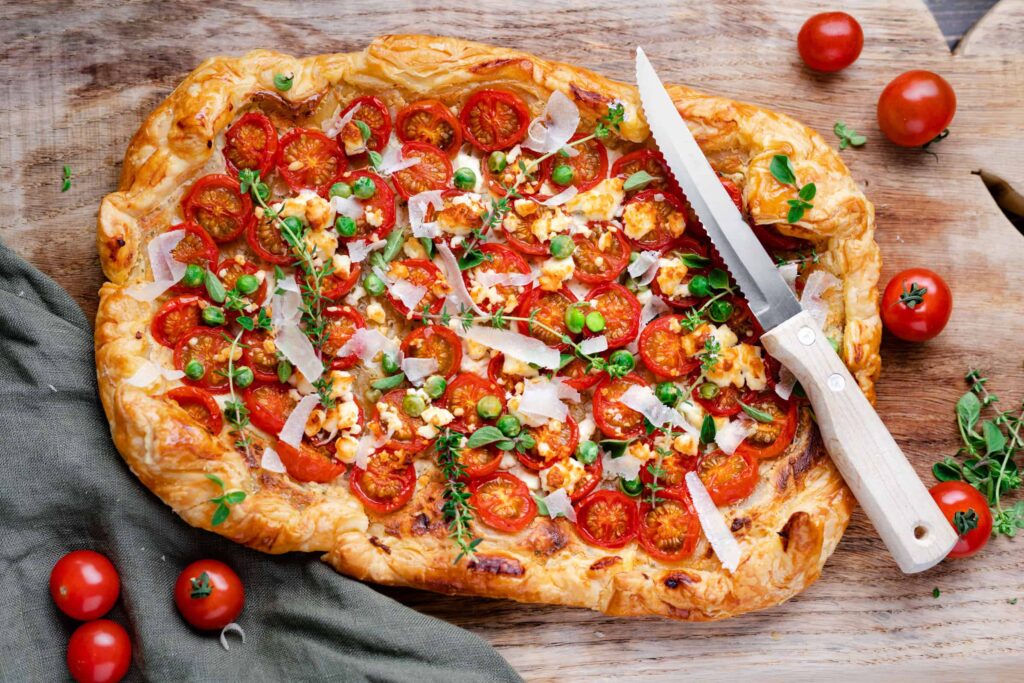 Last but not least in mijn overzicht van recepten met doperwten: hoe leuk is deze snelle tomatentaart met feta en doperwten? Niet alleen leuk, maar ook erg lekker trouwens ;-). Doperwten voeg ik ook graag toe als kleuraccent, zoals in deze hartige plaattaart. Een feest om te serveren!