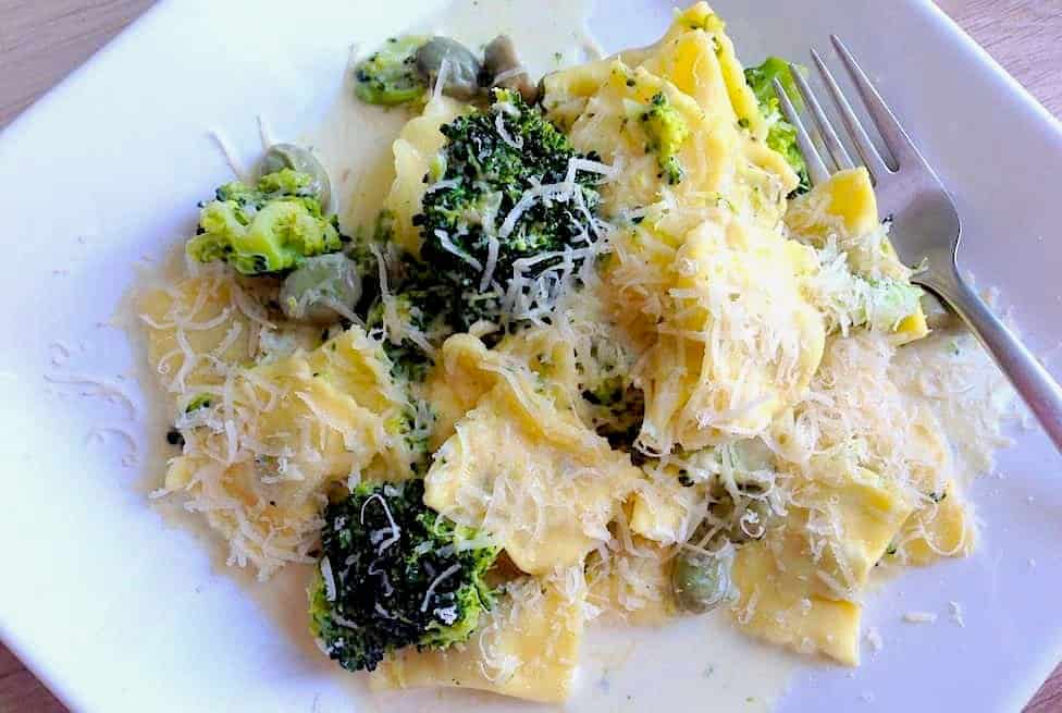 Ik eindig met een heerlijke groene pasta. Deze ravioli wordt gecombineerd met flink wat groenten zoals broccoli en tuinbonen. Nog een scheutje room en wat Parmezaanse kaas erbij en je zit heerlijk te eten.