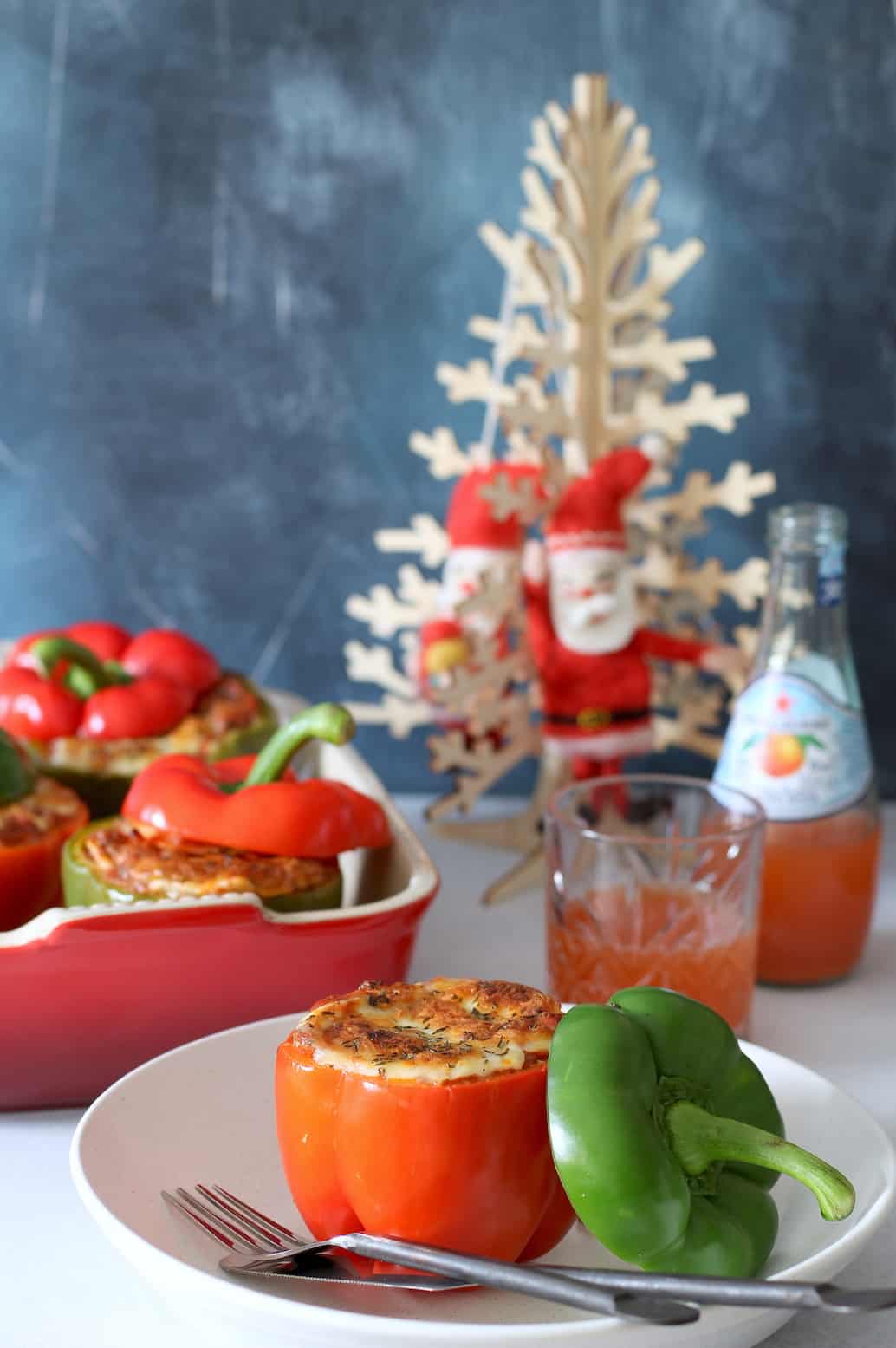 - Zet de paprika’s in een ovenschaal en bak 20 – 25 minuten in de oven tot de bovenkant goudbruin is geworden.