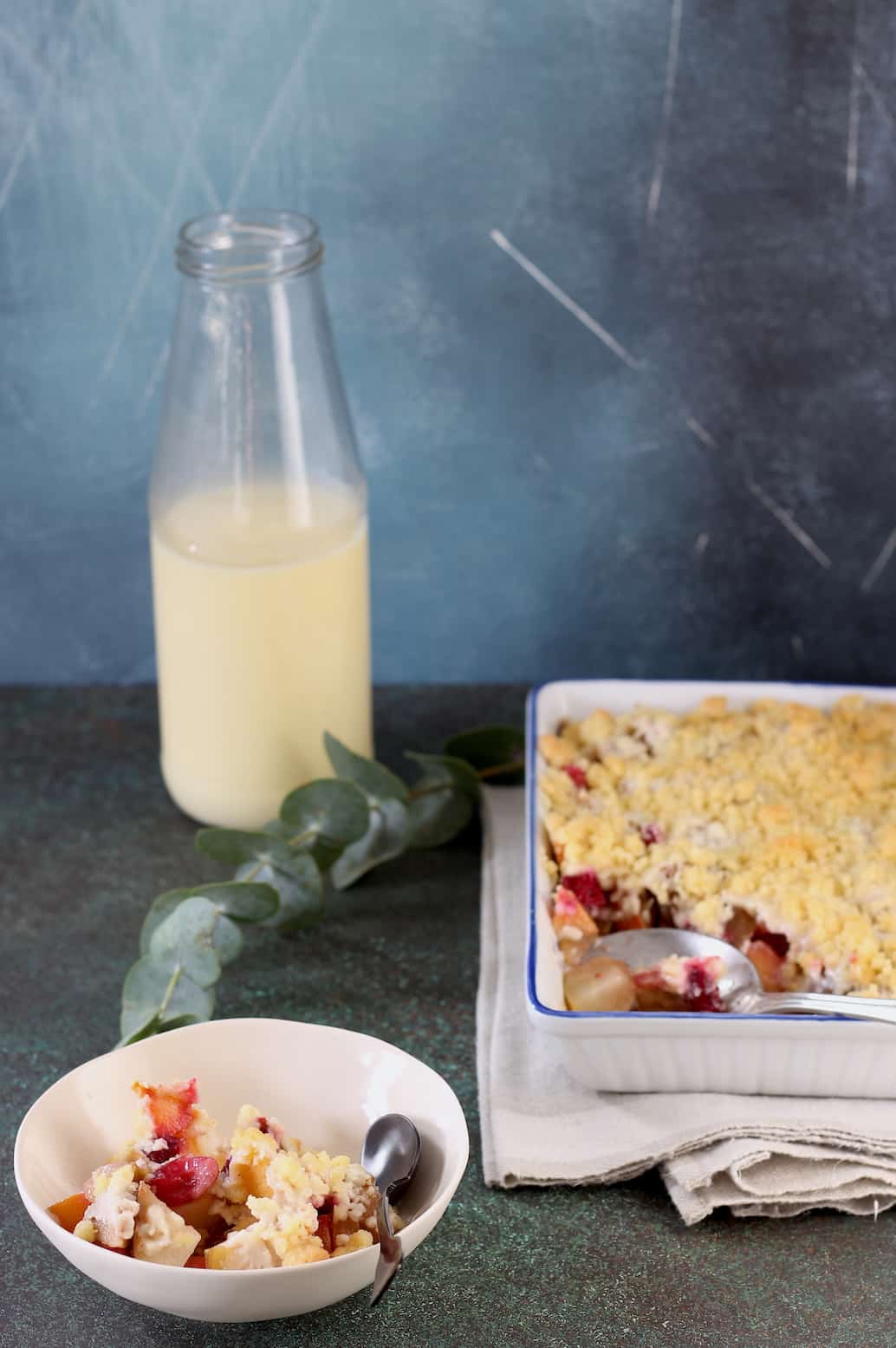 - Schep het fruit in een ovenschaal en verdeel daar de crumble over. Zet in de oven en bak 35 – 40 minuten. Serveer lauwwarm.