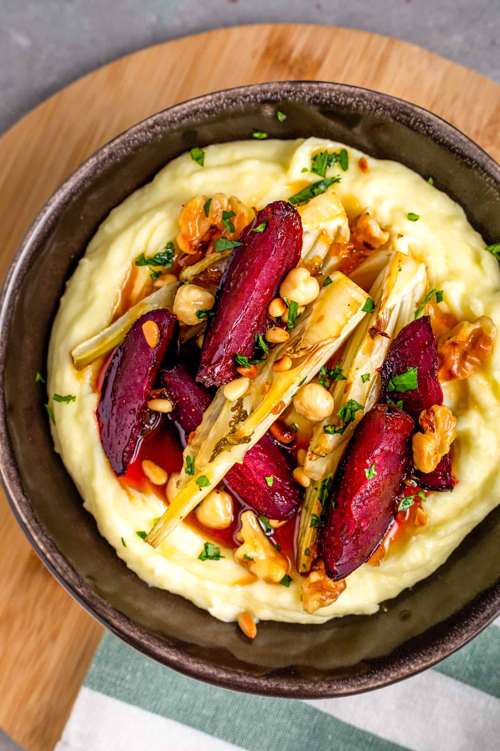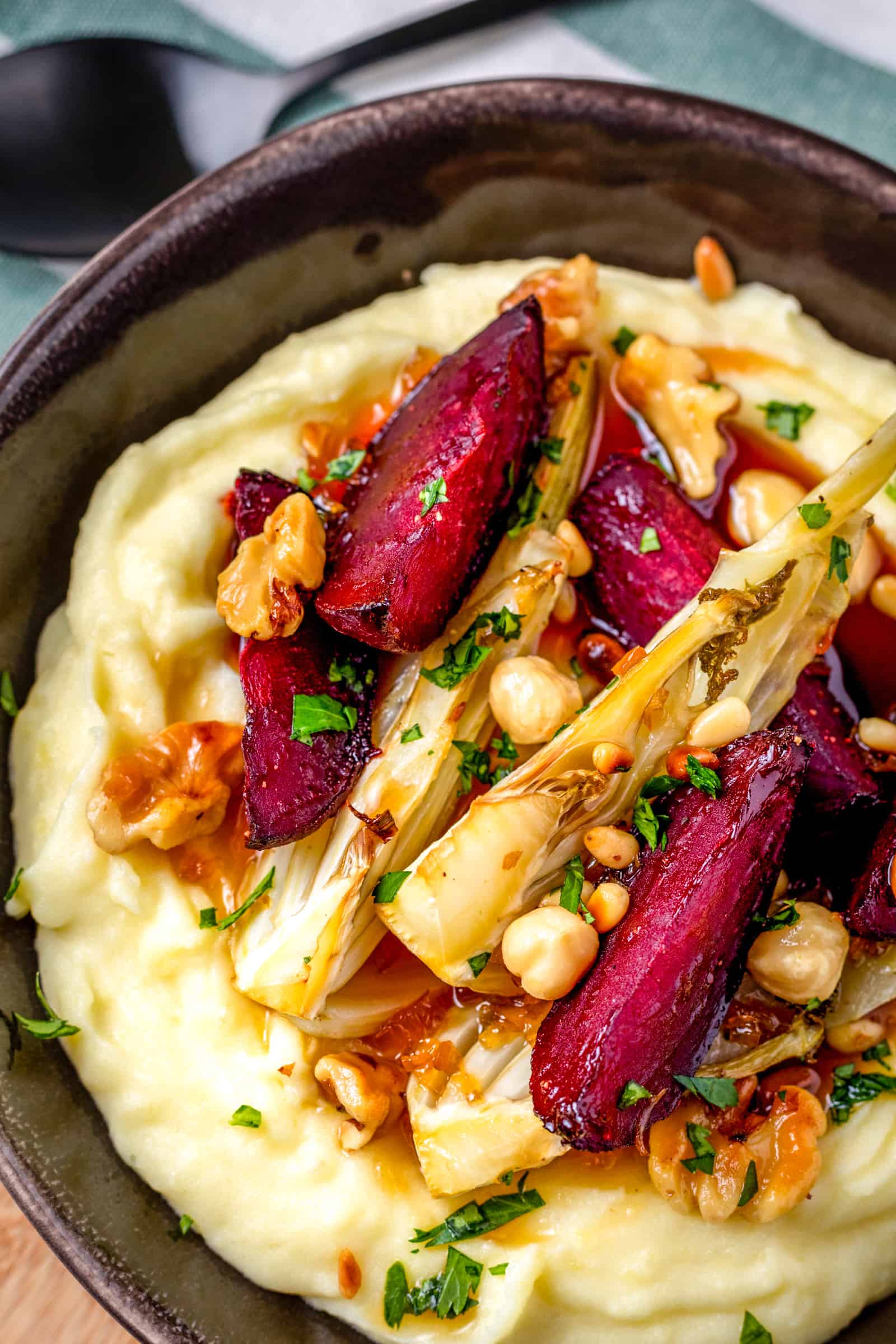 - Schep de puree over in een mooie grote schaal, of 4 kleinere schaaltjes. Garneer met de geroosterde venkel en biet, besprenkel met de saus en strooi wat noten erover.