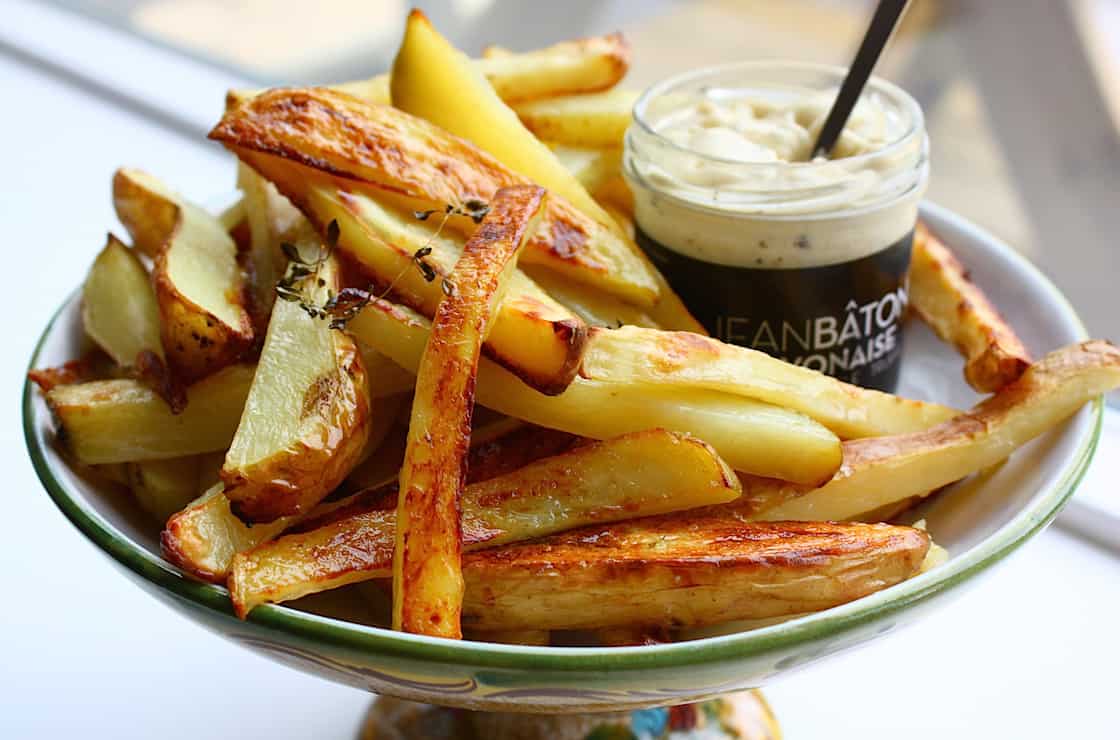 Mayonaise maak je van eidooiers en olie en dat kun je heel makkelijk zelf doen. Maar daar heb ik heel vaak geen zin in en ik koop net zo lief goede mayonaise. Een van mijn favoriete merken is Jean Bâton. Die maken de mayonaise precies zoals het hoort. Van minimaal 75% olie en 7,5% eidooier om precies te zijn. Daar voegen ze allemaal heerlijke ingrediënten aan toe voor de verschillende smaken. Maar kunstmatige geur-, kleur- en smaakstoffen gaan er niet in. Vooral de truffelmayonaise gaat er bij ons gretig doorheen en daarom vandaag dit recept voor een bijgerecht van aardappeltjes uit de oven met truffelmayonaise.