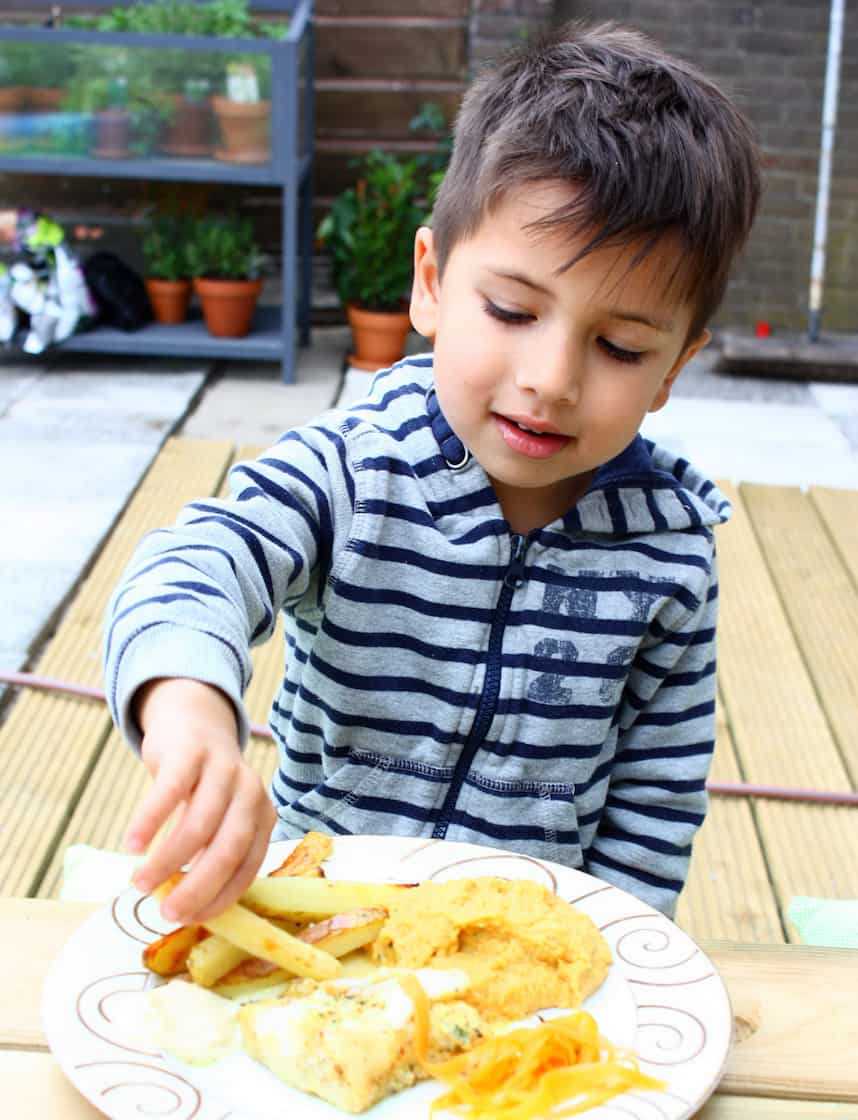 Zet het bakblik in de oven en bak de aardappeltjes in 45 minuten gaar en goudbruin, schep halverwege een keer om. Serveer met de truffelmayonaise en wie weet heb je straks net zo’n gelukkig kind als deze.