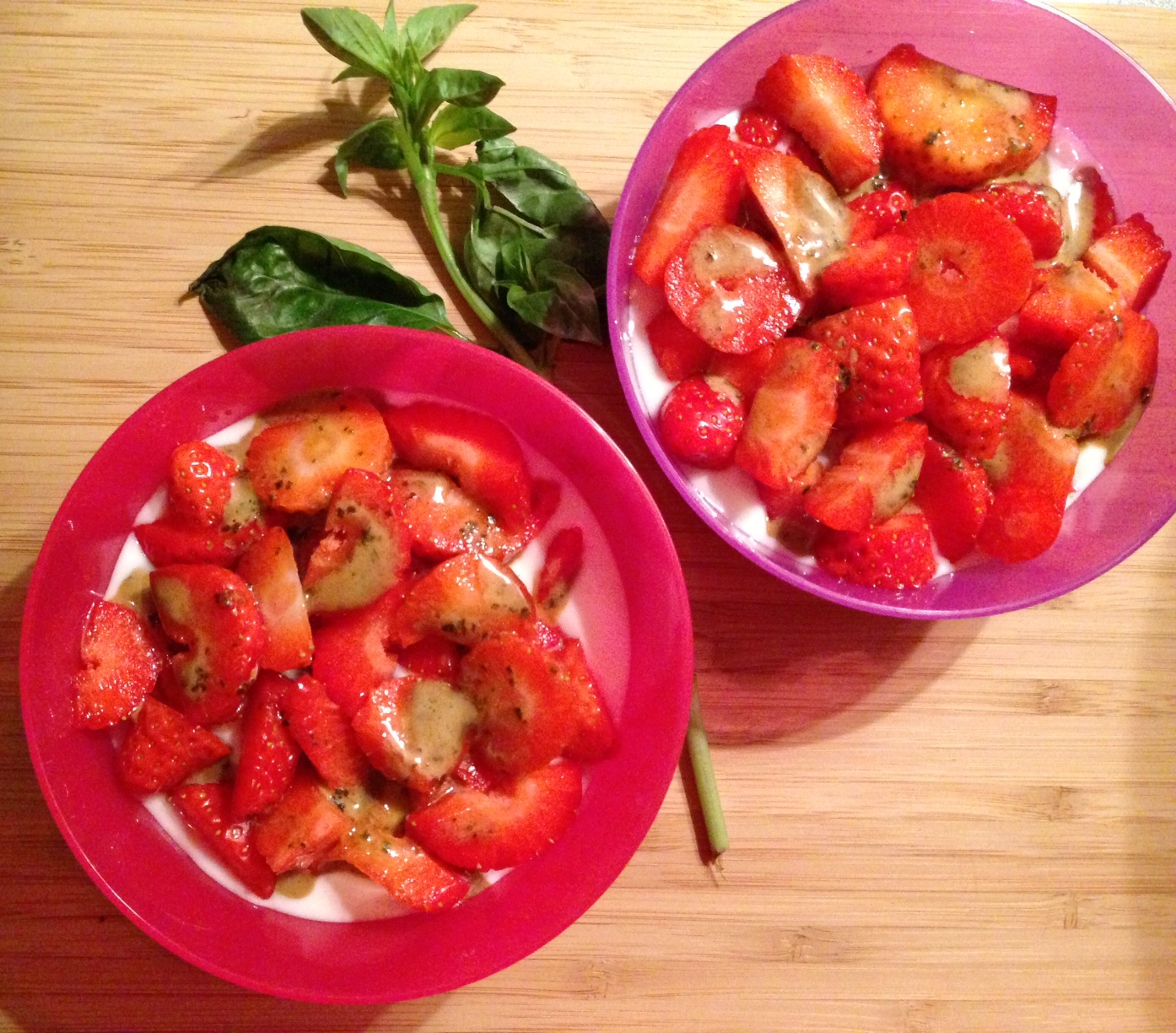 Een paar van jullie gaan nu misschien denken dat ik gek ben geworden. Aardbeien met basilicum en balsamico? Ja jongens, dat is dus echt heel erg lekker Ik had van de week nog een paar takjes basilicum over en toen ben ik maar eens aan het experimenteren geslagen. Misschien nog lekkerder als je de balsamico inkookt met de basilicum en suiker en daarna laat afkoelen. Maar dat is een projectje voor het weekend en niet voor doordeweeks als ik snel een toetje voor mijn kind wil maken.