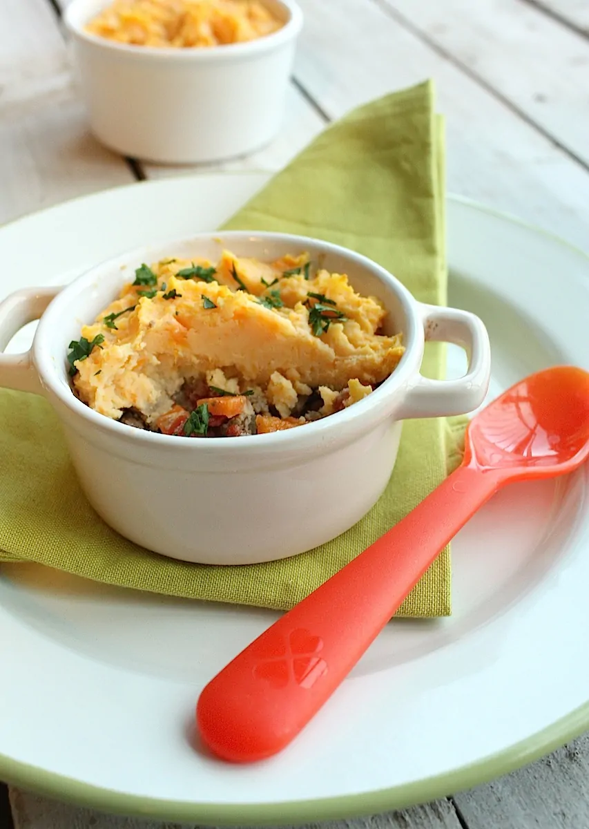 Neem 4 eenpersoons ovenschaaltjes om de bakjes te vullen. Mocht je die nou niet in huis hebben dan pak je een grote ronde ovenschaal. Daar wordt de smaak niet minder van. Verdeel het gehaktmengsel over de 4 bakjes en schep hier de zoete aardappelpuree op als een dakje. Bak de familiebakjes vervolgens 15 minuten in de oven totdat de puree een goudbruin randje heeft gekregen.
